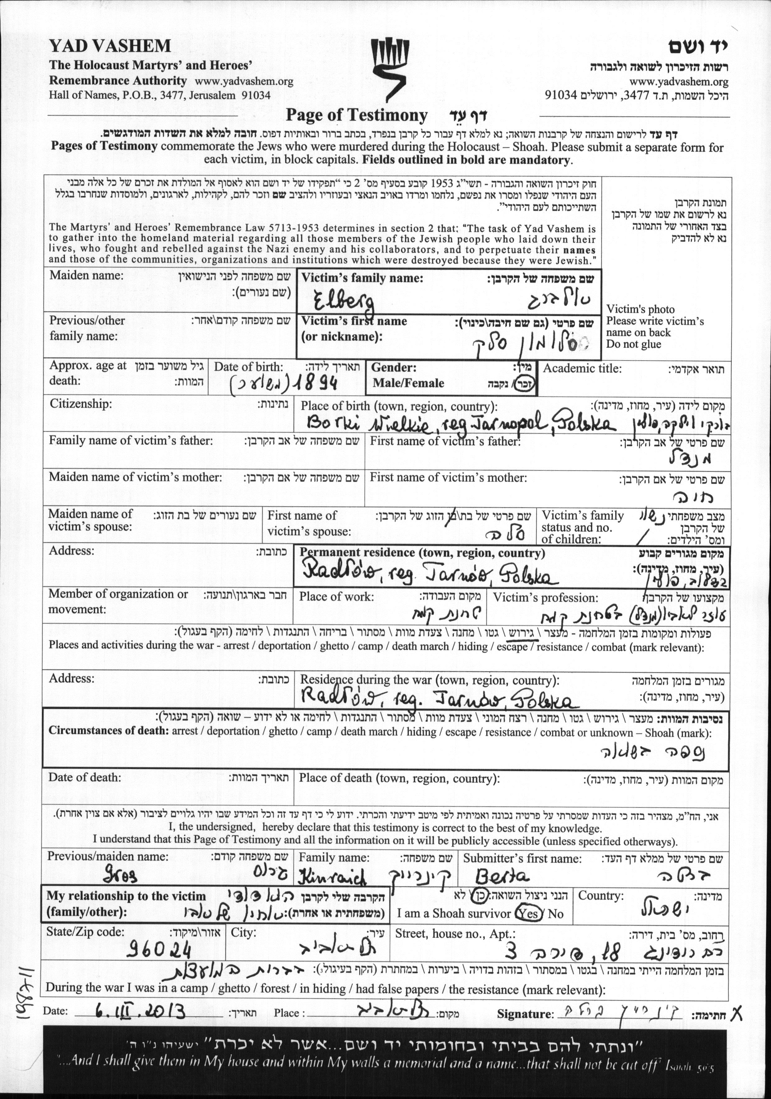 Salomon Elberg wurde im Jahr 1894 in Borki Wielkie, Polen geboren. Er war Gehilfe/-in. Vor dem Zweiten Weltkrieg lebte er in Radlow, Polen.