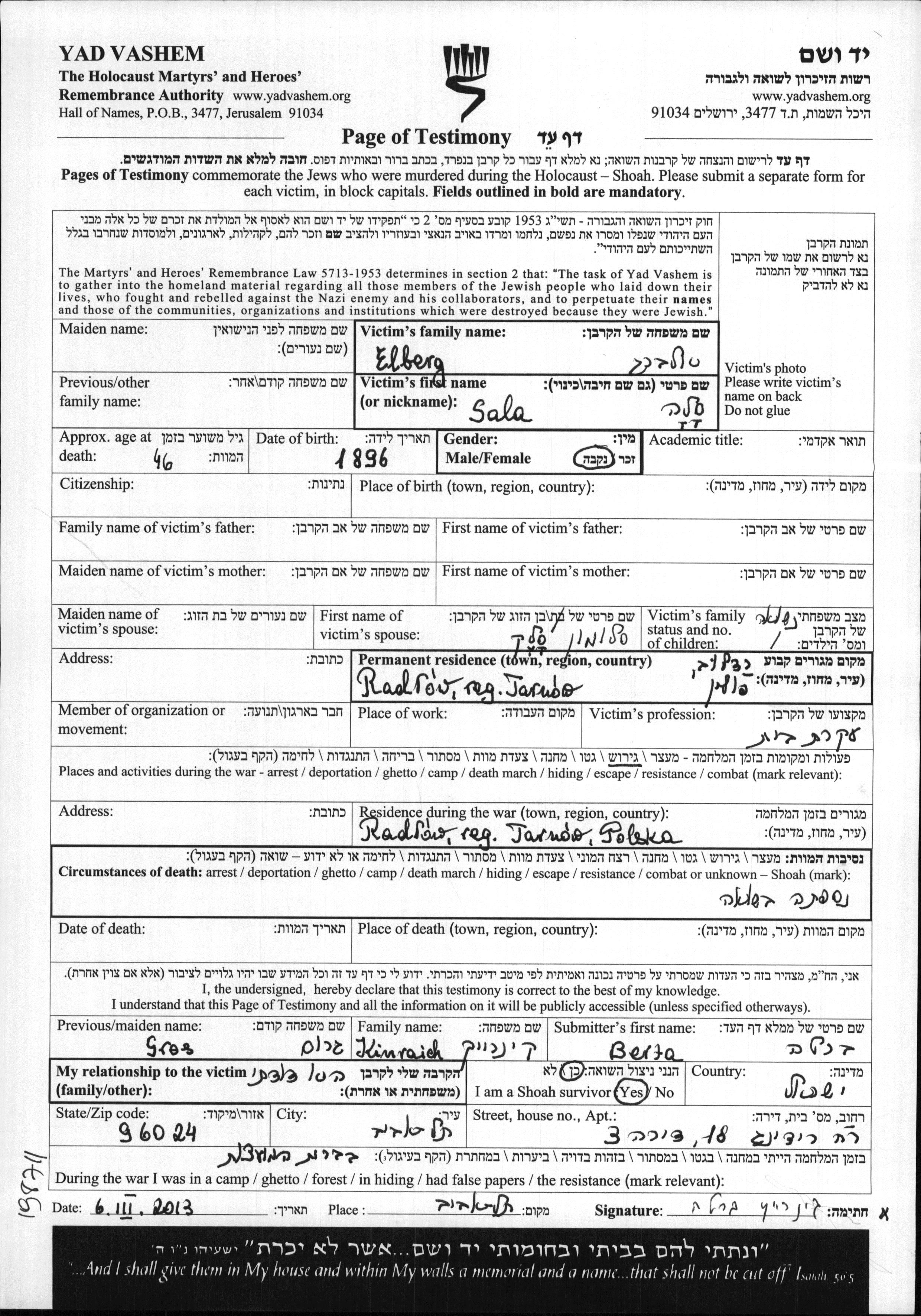 Sala Elberg wurde im Jahr 1896 geboren. Sie war Hausfrau. Vor dem Zweiten Weltkrieg lebte sie in Radlow, Polen.