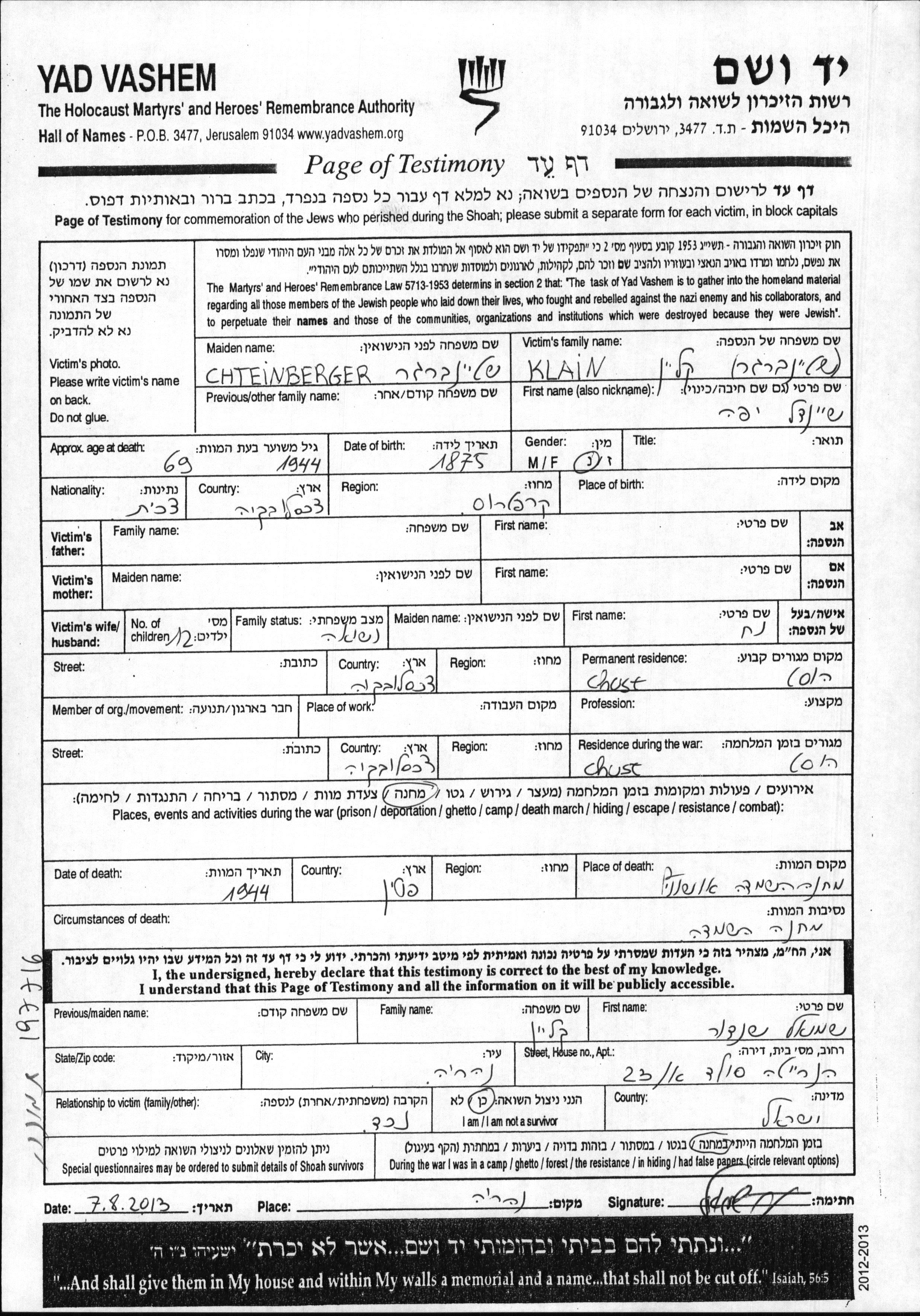 Sheindl Yafa Klain, geb. Chteinberger wurde im Jahr 1875 in Carpathian Ruthenia, Tschechoslowakei geboren. Vor dem Zweiten Weltkrieg lebte sie in Chust, Tschechoslowakei. Sheindl Yafa wurde in der Schoah ermordet. Todesort: Auschwitz, Polen im Jahr 1944.