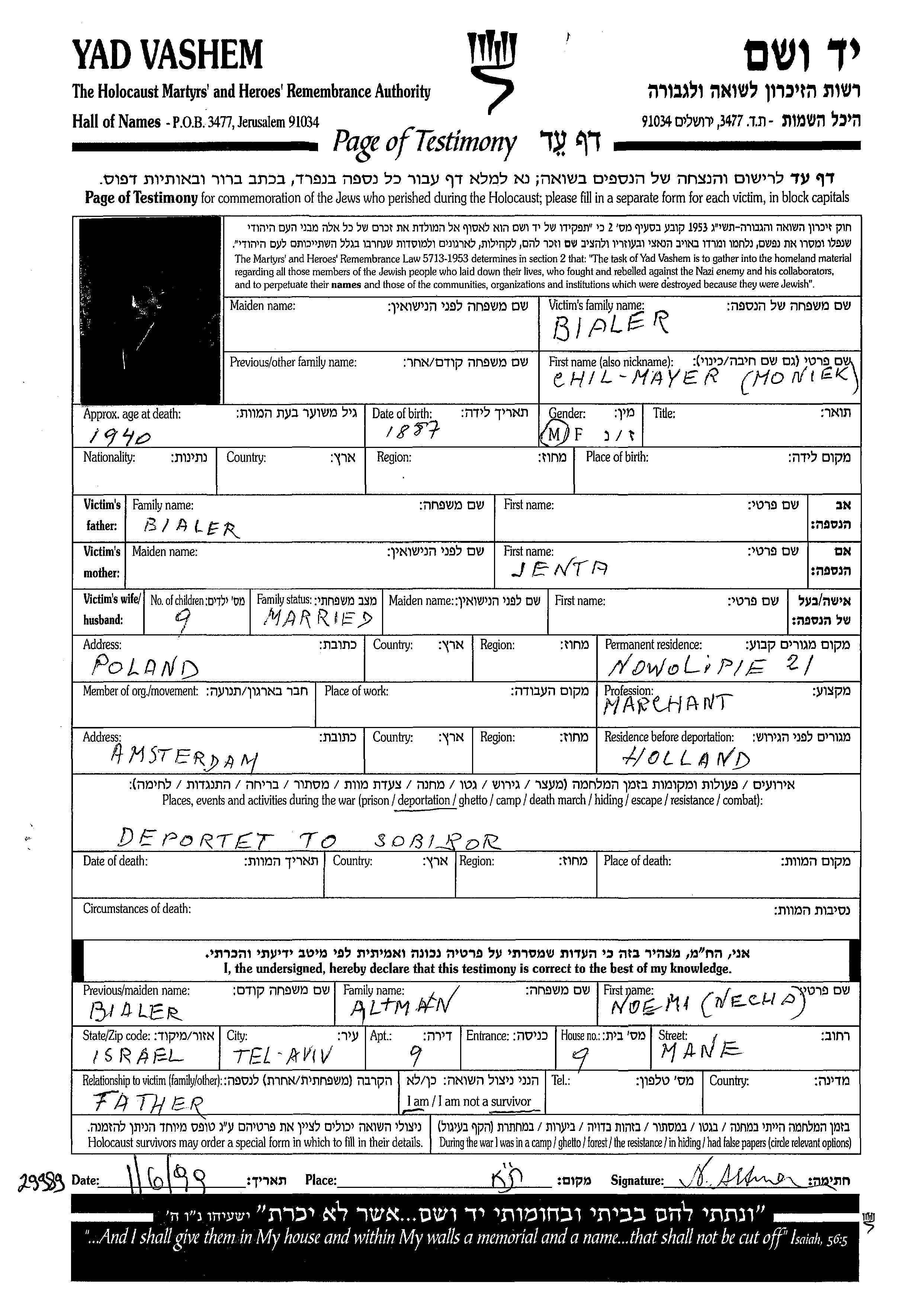 Bialer Chil Mayer Moniek 1887 Polen Gedenkblatt