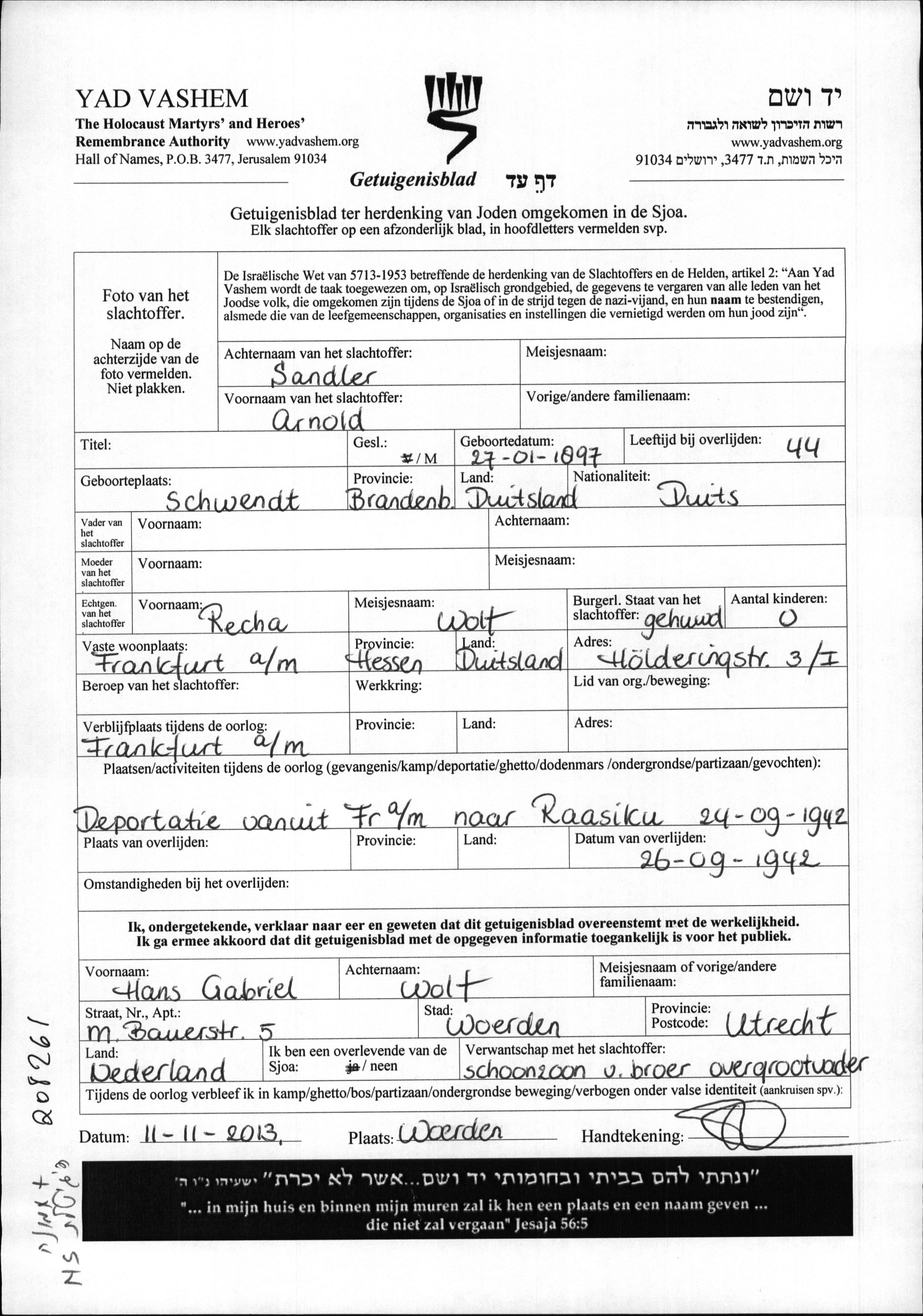 Arnold wurde in der Schoah ermordet. Todesort: Raasiku, Estland im Jahr 26/09/1942.