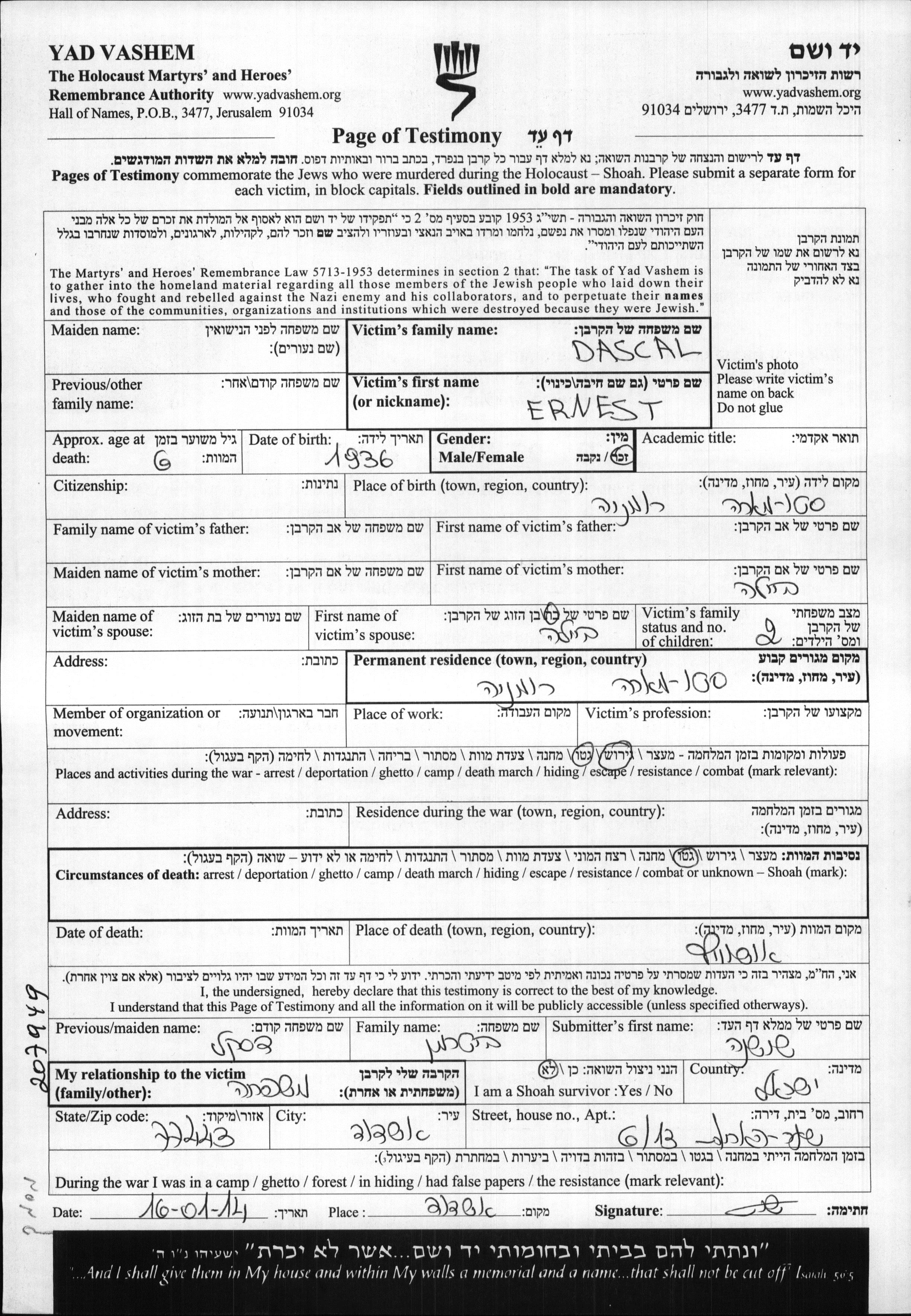 Ernest wurde in der Schoah ermordet. Todesort: Auschwitz, Polen.