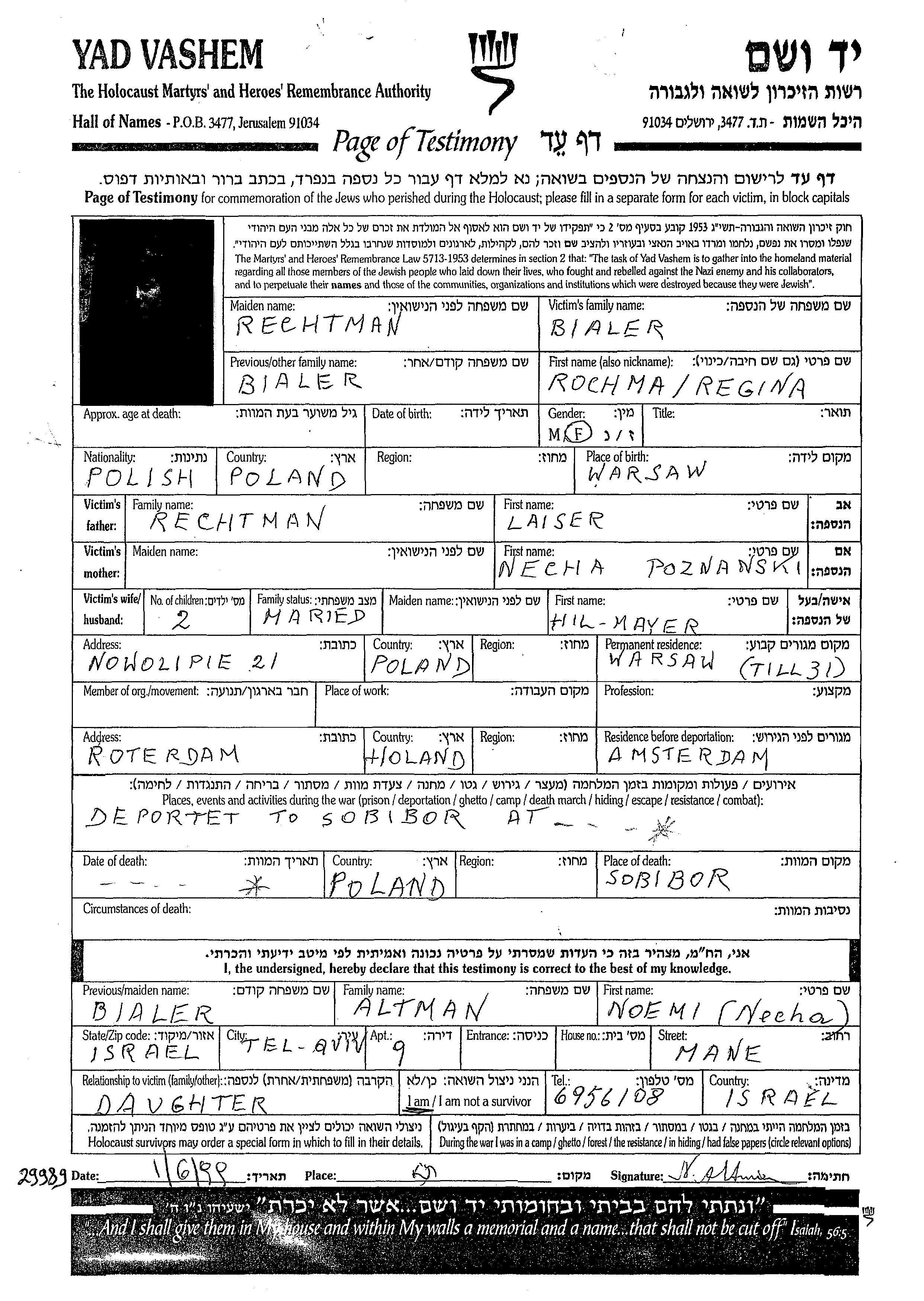 Rochma Regina Bialer, geb. Rechtman wurde in Warszawa, Polen geboren. Vor dem Zweiten Weltkrieg lebte sie in Warszawa, Polen.