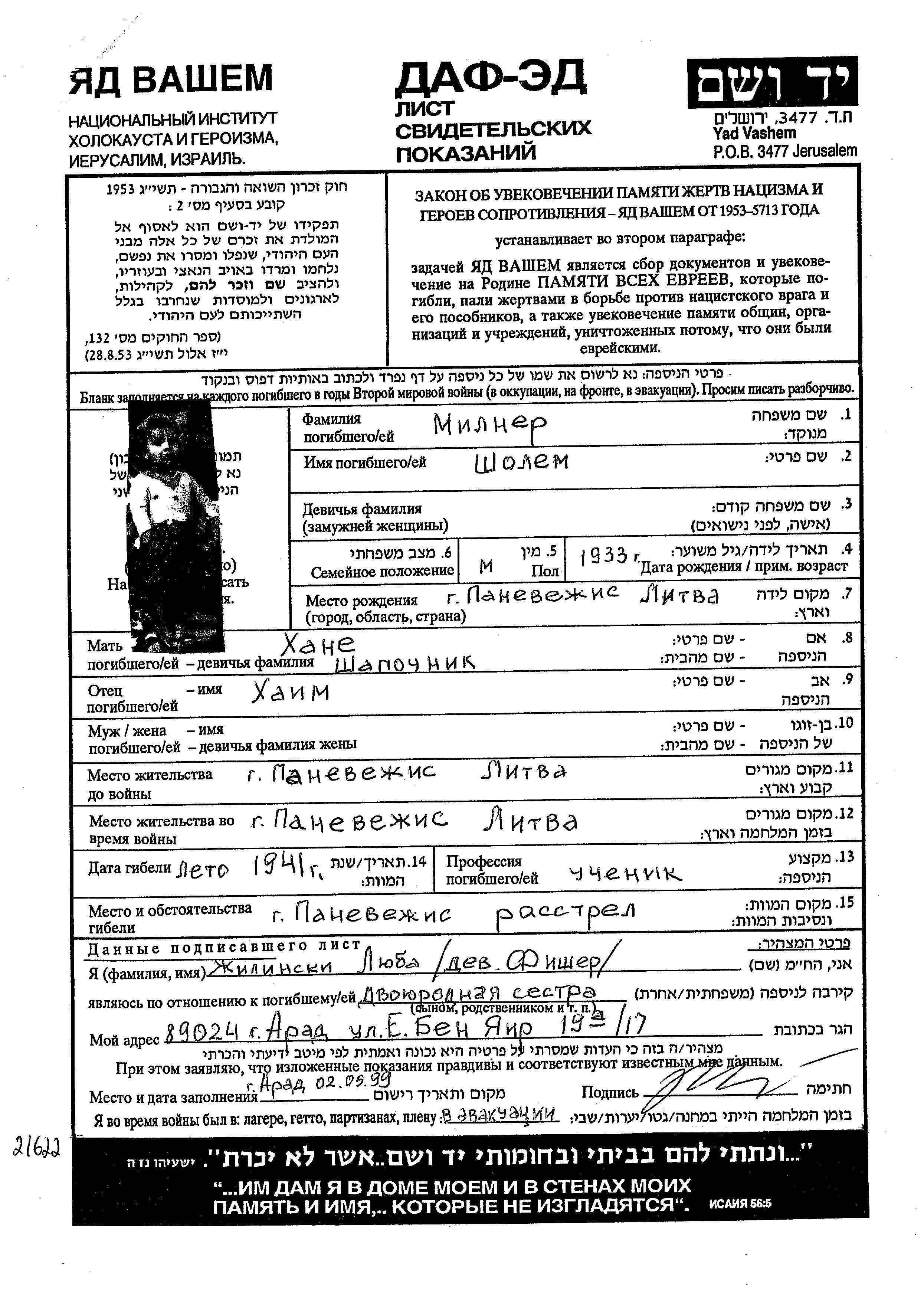 Shalom Milner wurde im Jahr 1933 in Panevezys, Litauen geboren. Er war Schüler/-in. Vor dem Zweiten Weltkrieg lebte er in Panevezys, Litauen.