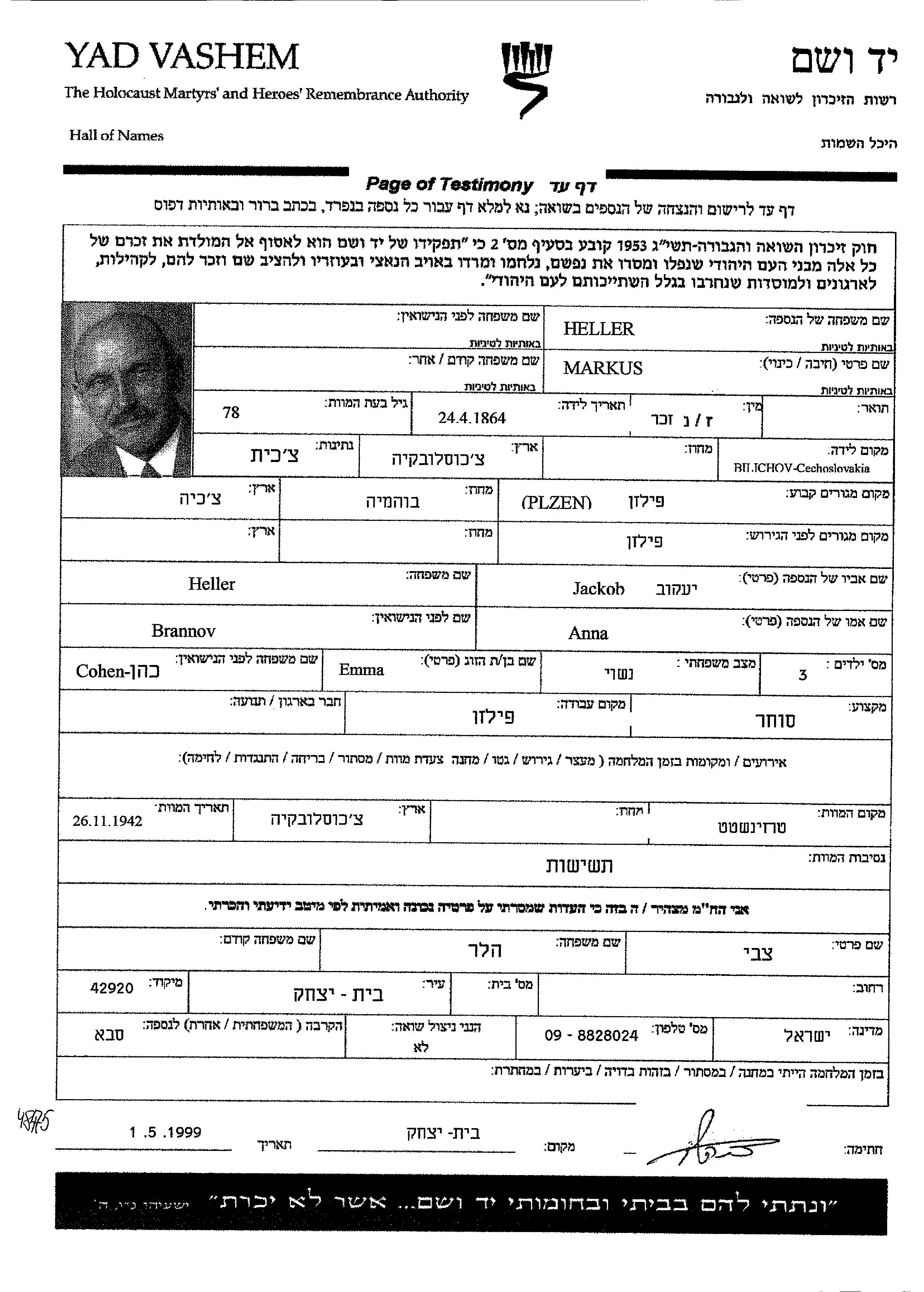 Markus wurde in der Schoah ermordet. Todesort: Terezin, Tschechoslowakei im Jahr 26/11/1942.