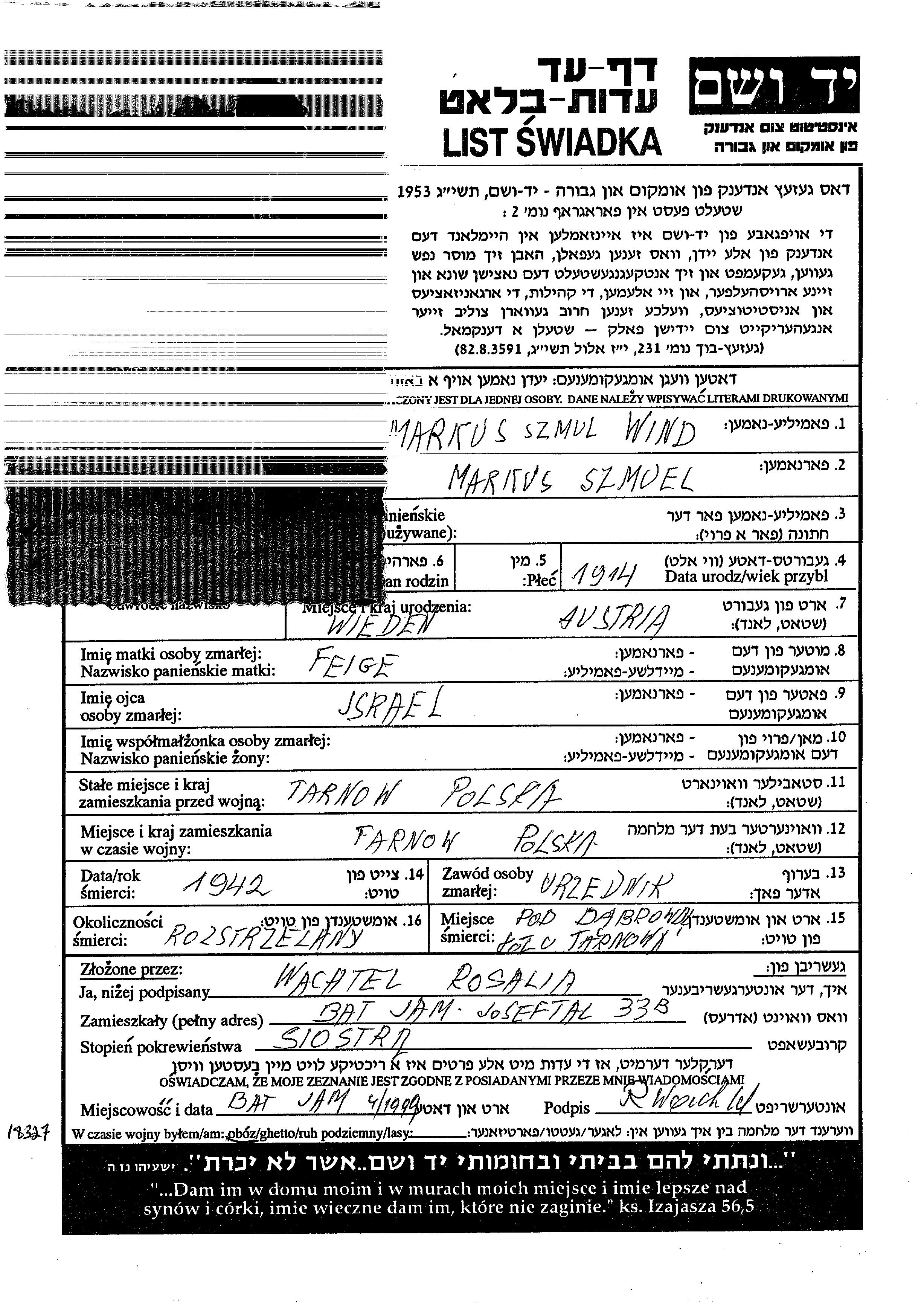 Szmuel Markus Wind wurde im Jahr 1914 in Wien, Österreich geboren. Er war Angestellte/-r. Vor dem Zweiten Weltkrieg lebte er in Tarnow, Polen.