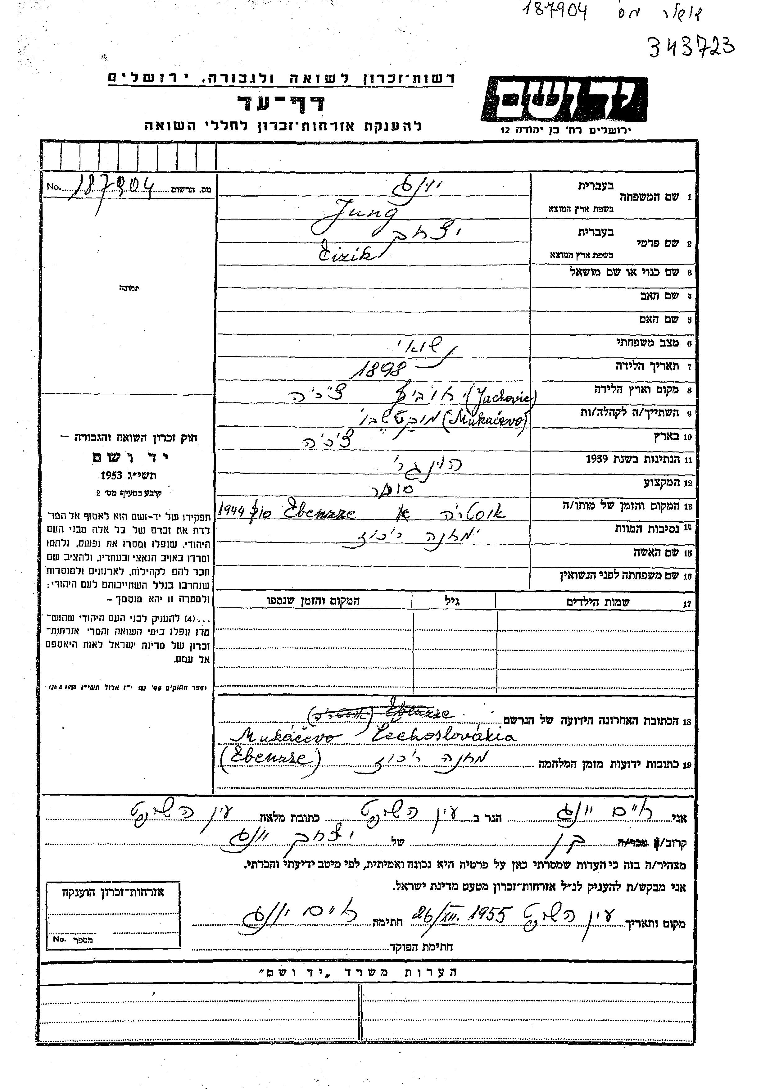 Aizik Jung wurde im Jahr 1898 in Lachovec, Tschechoslowakei geboren. Er war Kaufmann/-frau. Vor dem Zweiten Weltkrieg lebte er in Mukacevo, Tschechoslowakei.