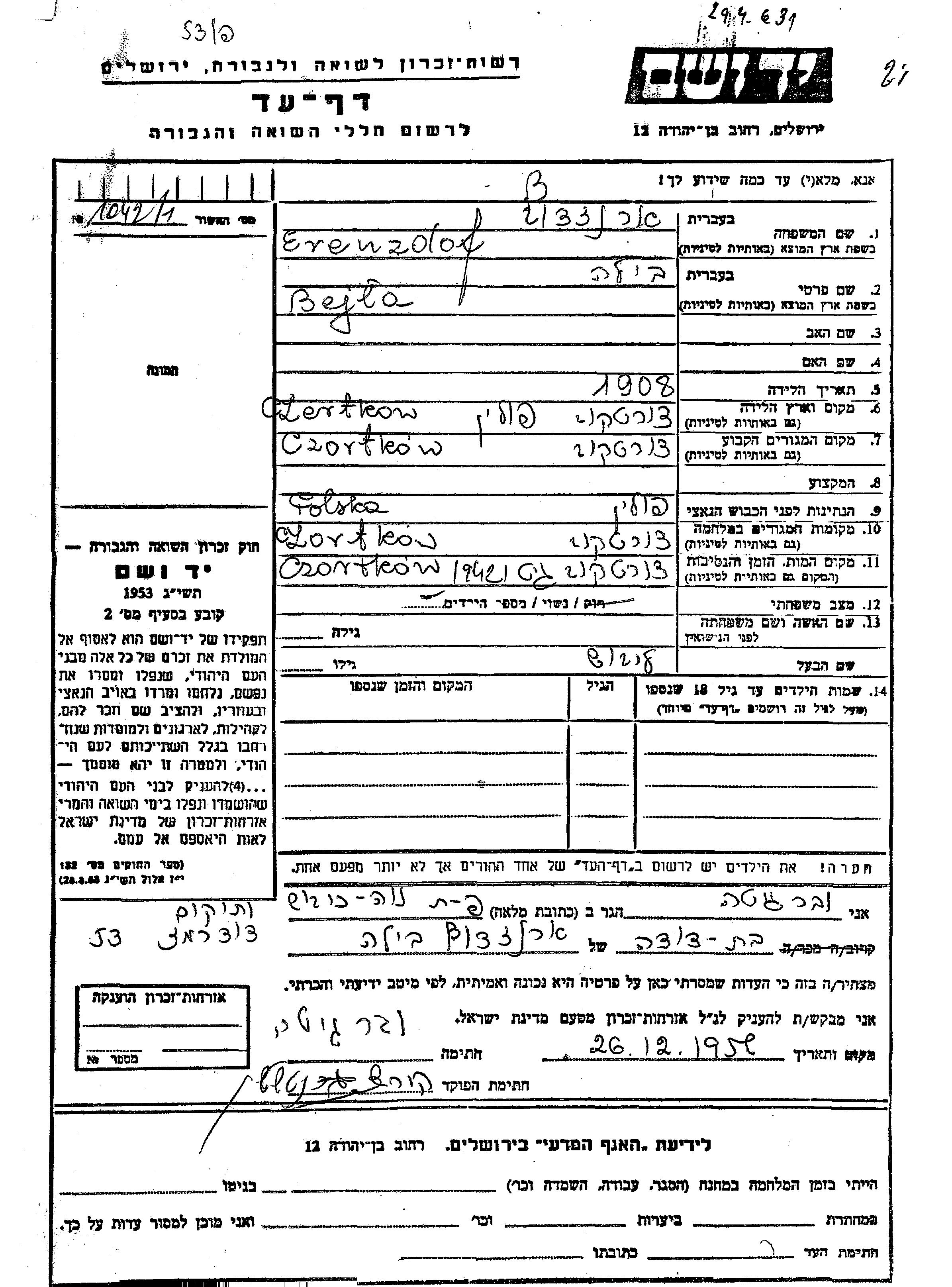 Bejla Erenzdof wurde im Jahr 1908 in Czortkow, Polen geboren. Vor dem Zweiten Weltkrieg lebte sie in Czortkow, Polen.
