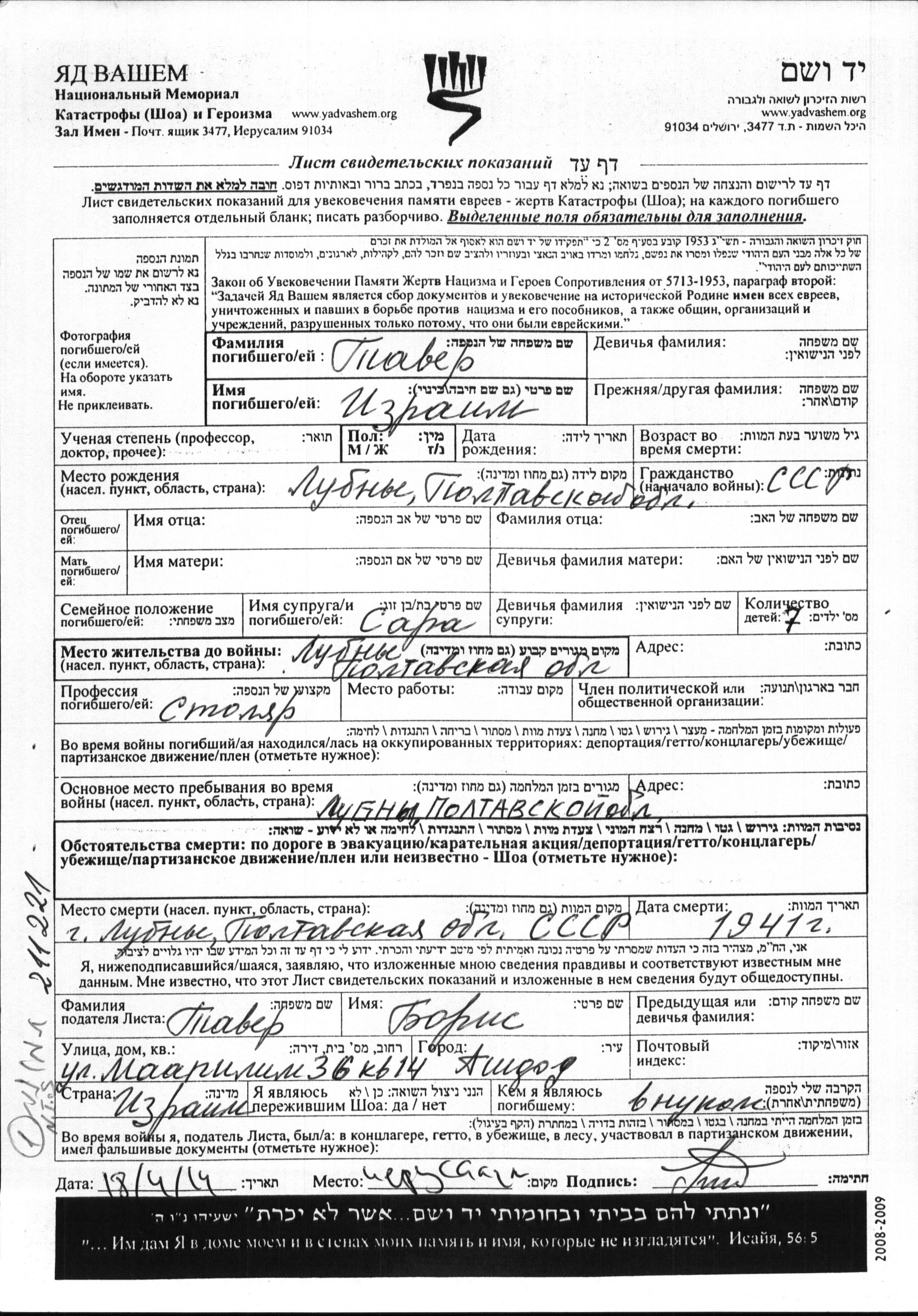 Izrail wurde in der Schoah ermordet. Todesort: Lubny, Ukraine (UdSSR) im Jahr 1941.