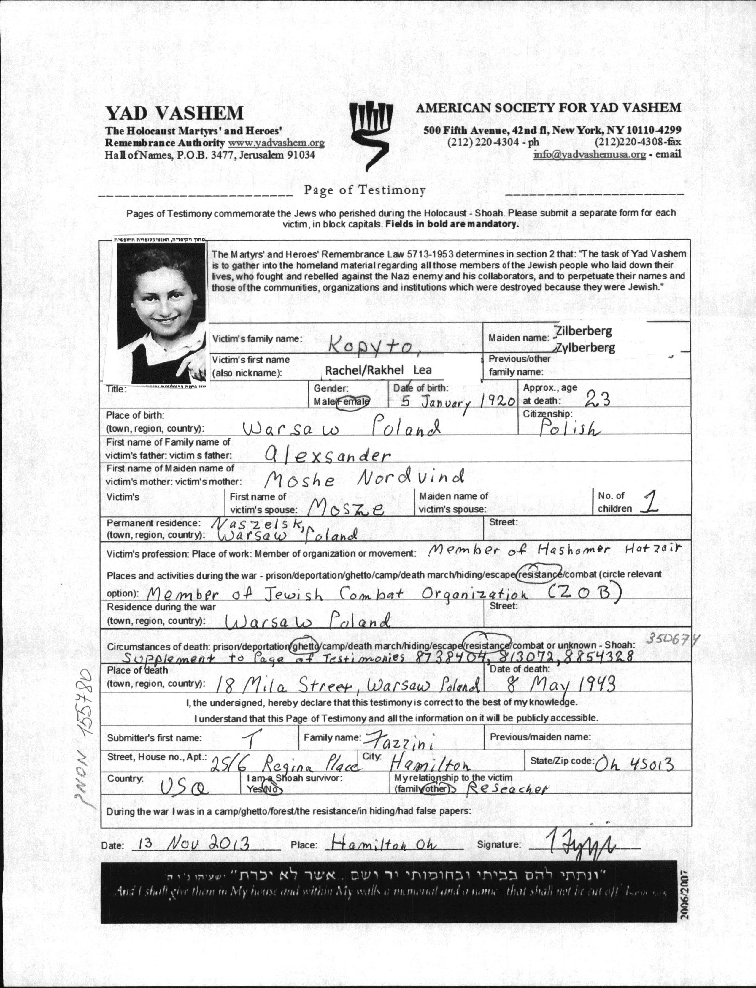 Rachel Lea wurde in der Schoah ermordet. Todesort: Warszawa, Polen im Jahr 08/05/1943.