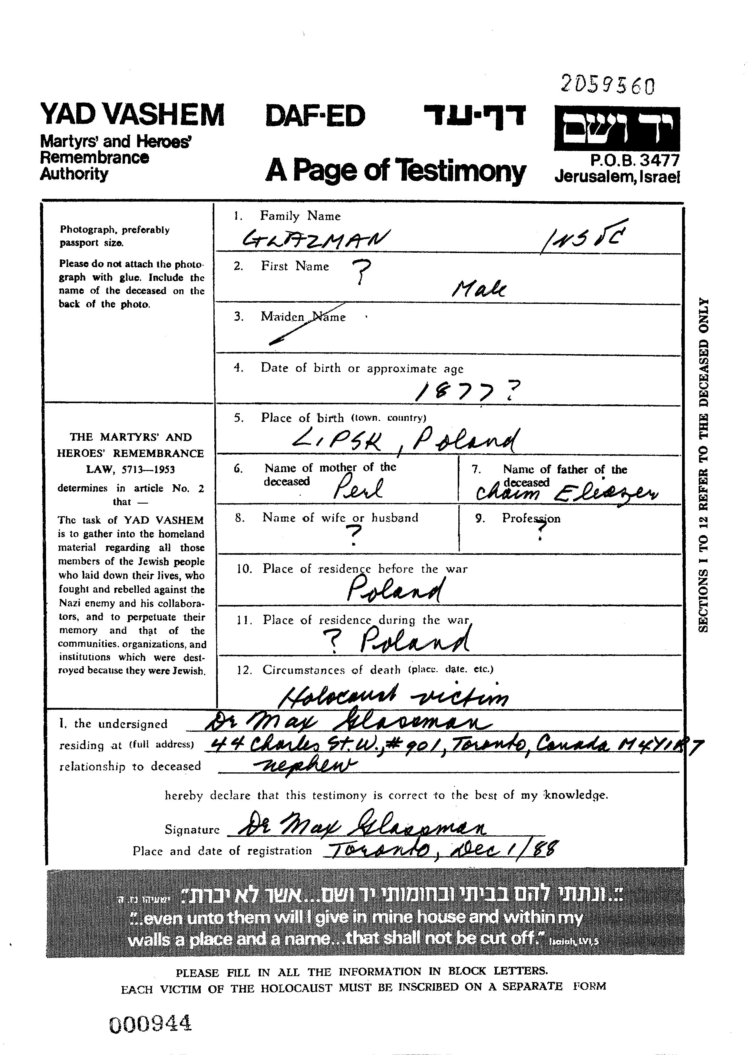 Vorname unbekannt Glazman wurde im Jahr 1877 in Lipsk, Polen geboren. Er war der Sohn von Chaim Eliezer und Perl. Vor dem Zweiten Weltkrieg lebte er in Polen. Während des Krieges war er in Polen.