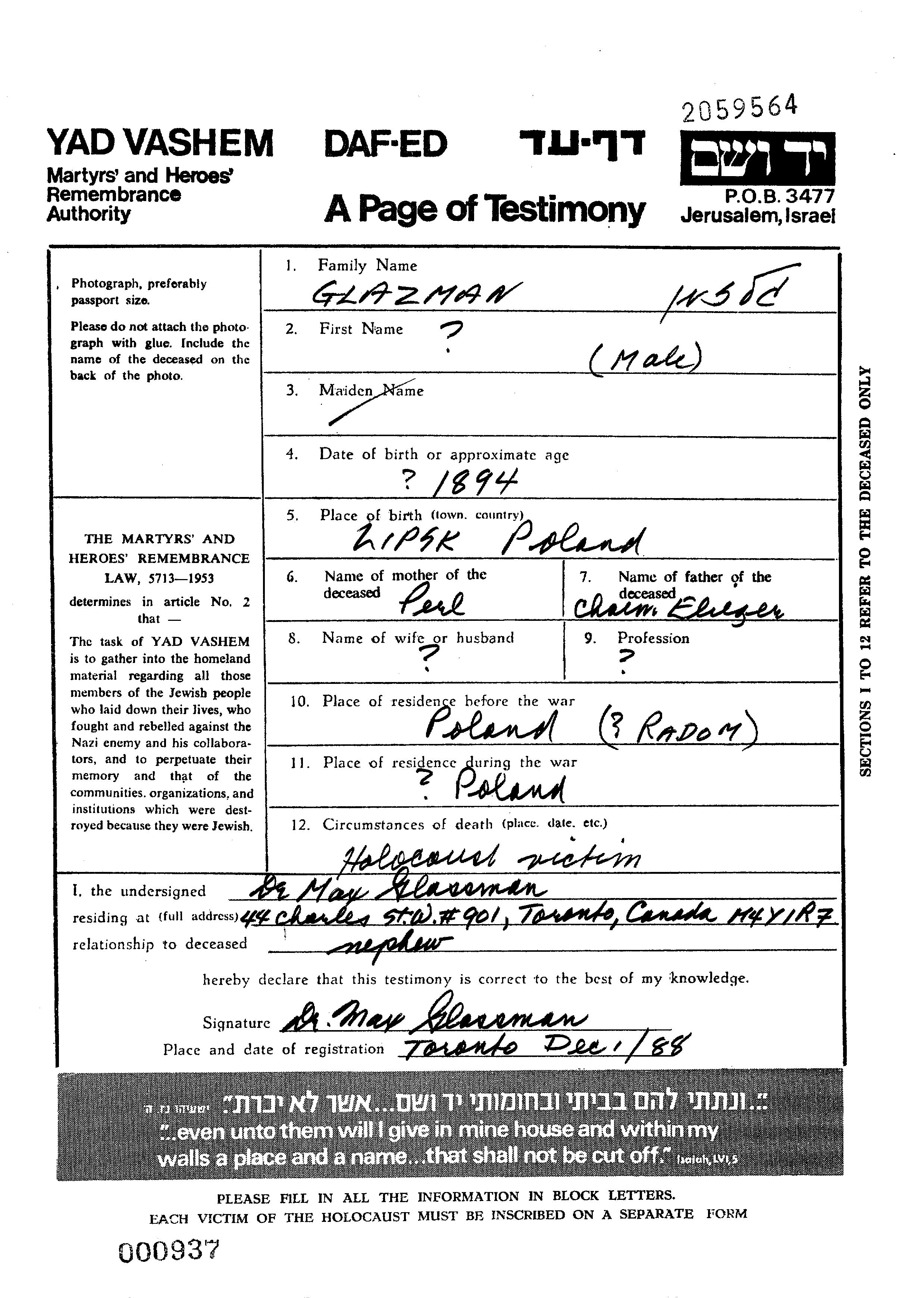 Vorname unbekannt Glazman wurde im Jahr 1894 in Lipsk, Polen geboren. Er war der Sohn von Chaim Eliezer und Perl. Vor dem Zweiten Weltkrieg lebte er in Radom, Polen. Während des Krieges war er in Polen.