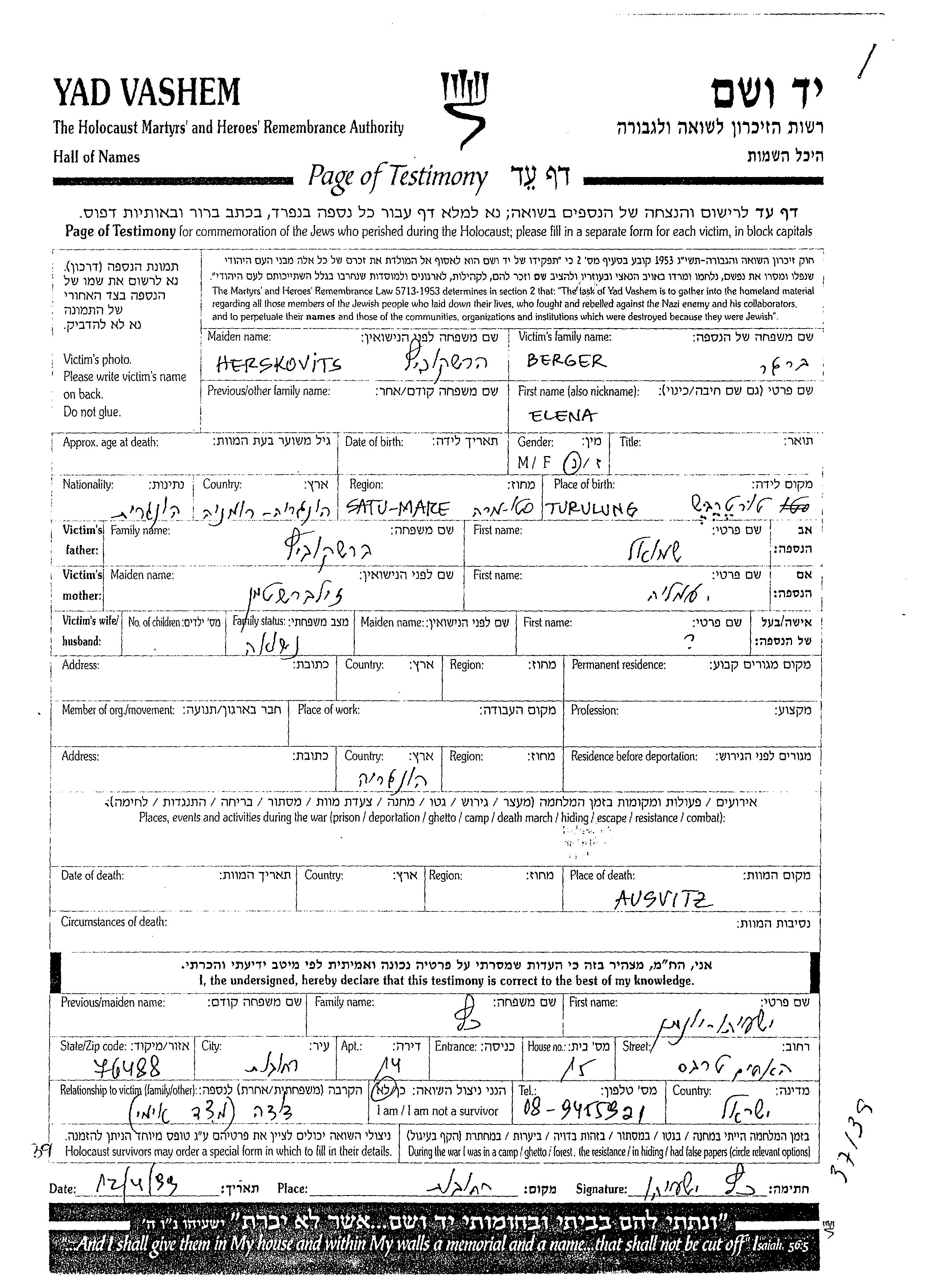 Elena wurde in der Schoah ermordet. Todesort: Auschwitz, Polen.