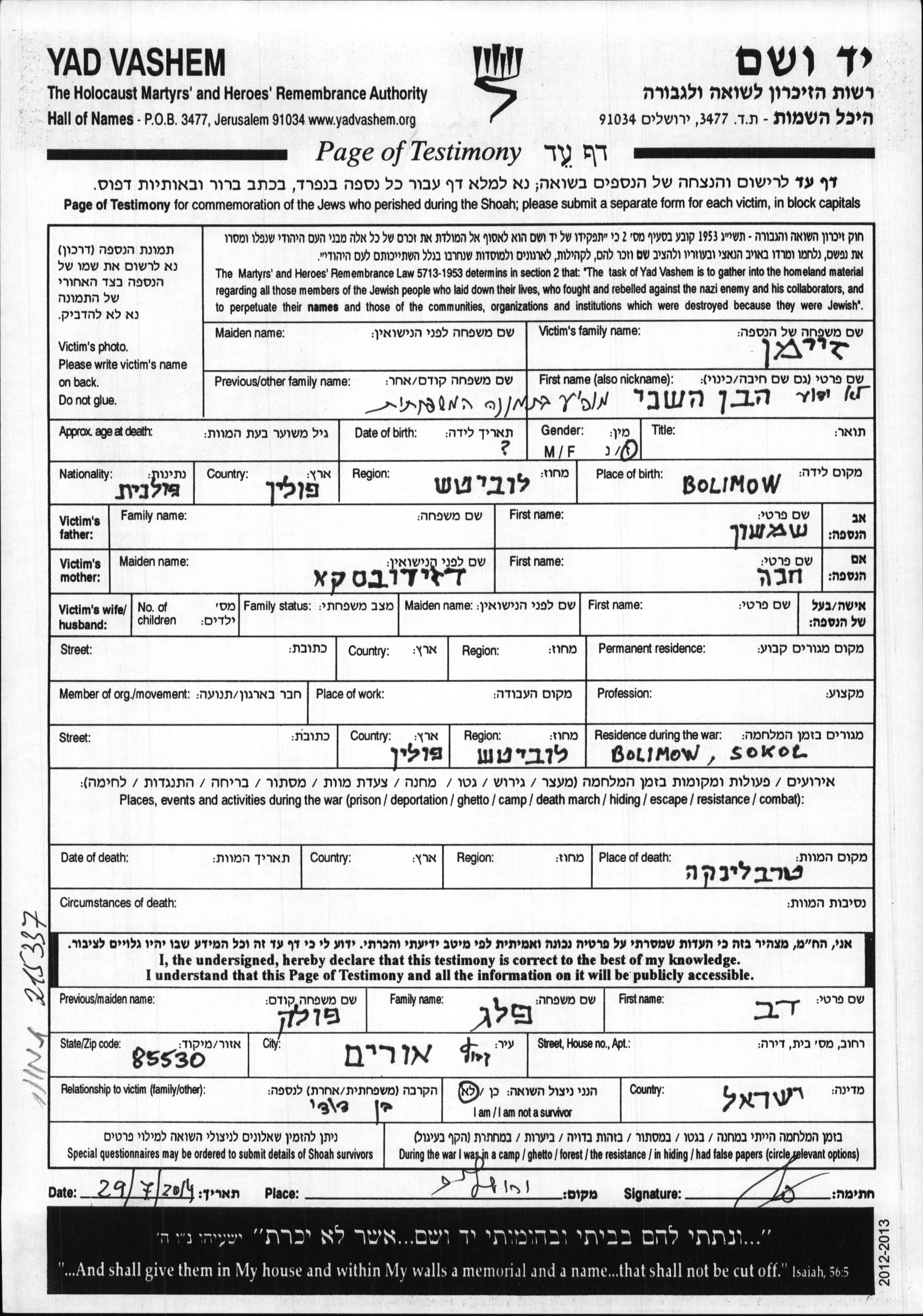 Vorname unbekannt Zeiman wurde in Bolimow, Polen geboren. Vor dem Zweiten Weltkrieg lebte er in Bolimow, Polen.