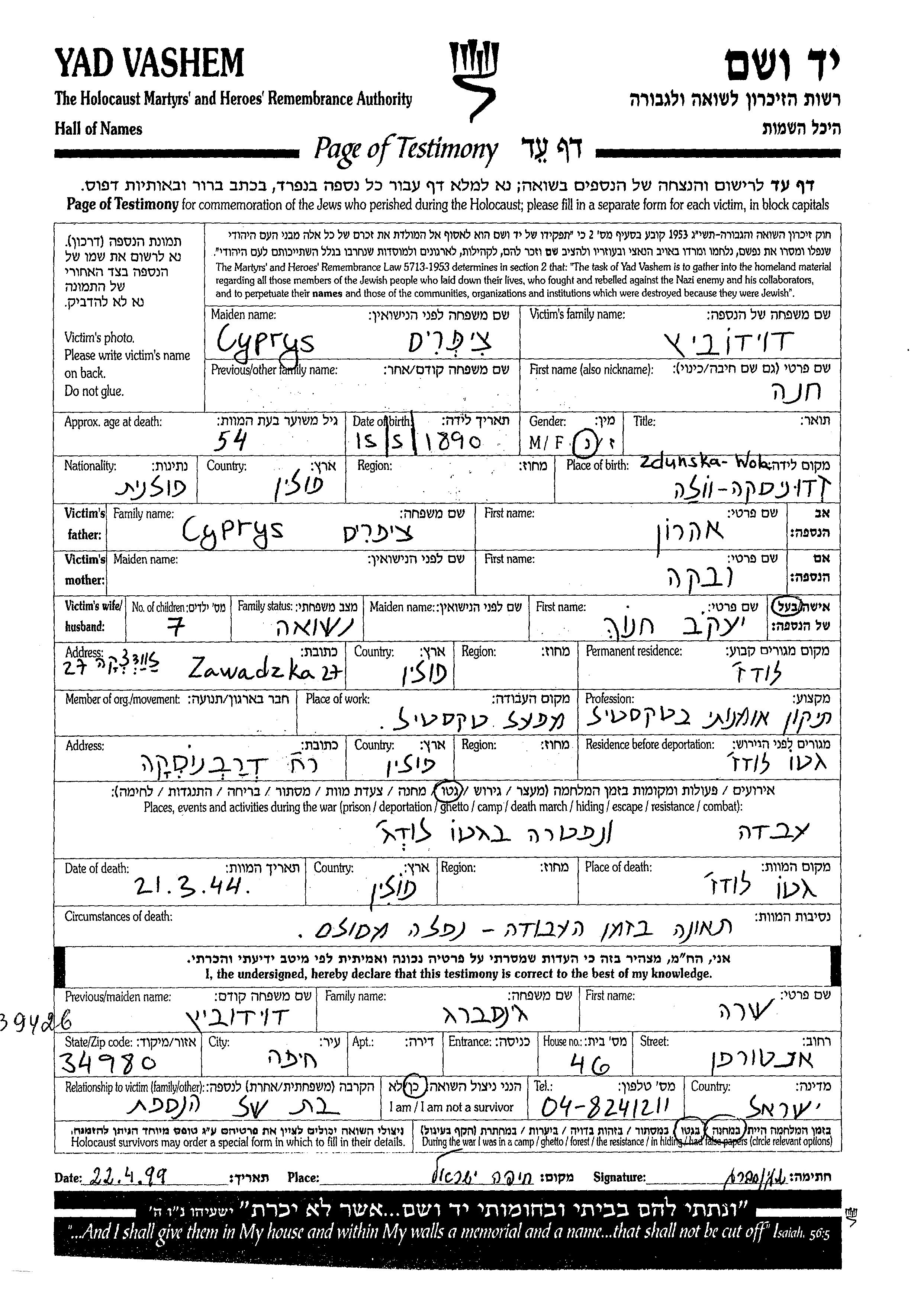 Khana Davidovitz, geb. Cyprys wurde im Jahr 1890 in Zdunska Wola, Polen geboren. Vor dem Zweiten Weltkrieg lebte sie in Łódź, Polen.