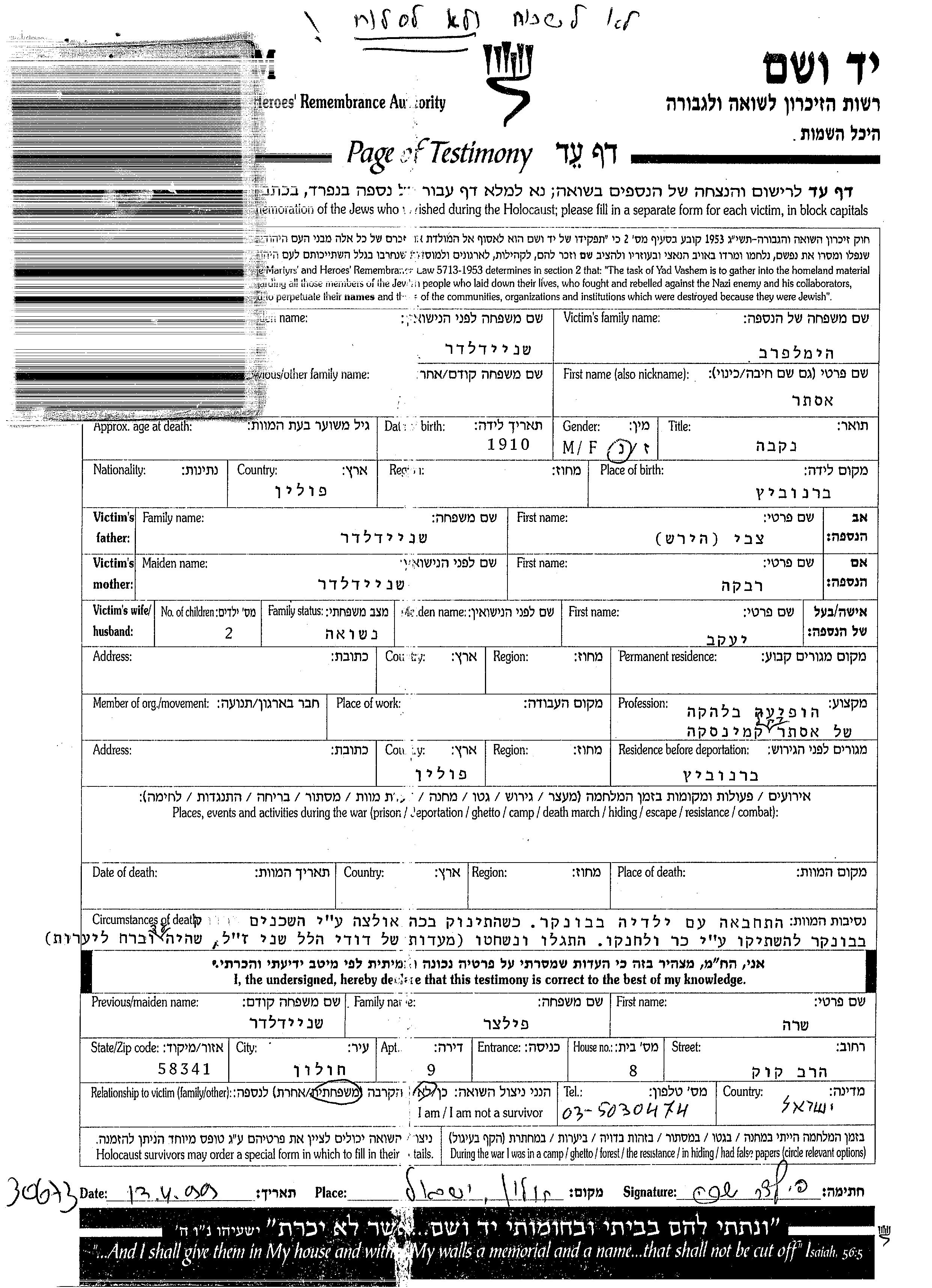 Himelfarb Ester 1910 unbekannter Ort, Gedenkblatt