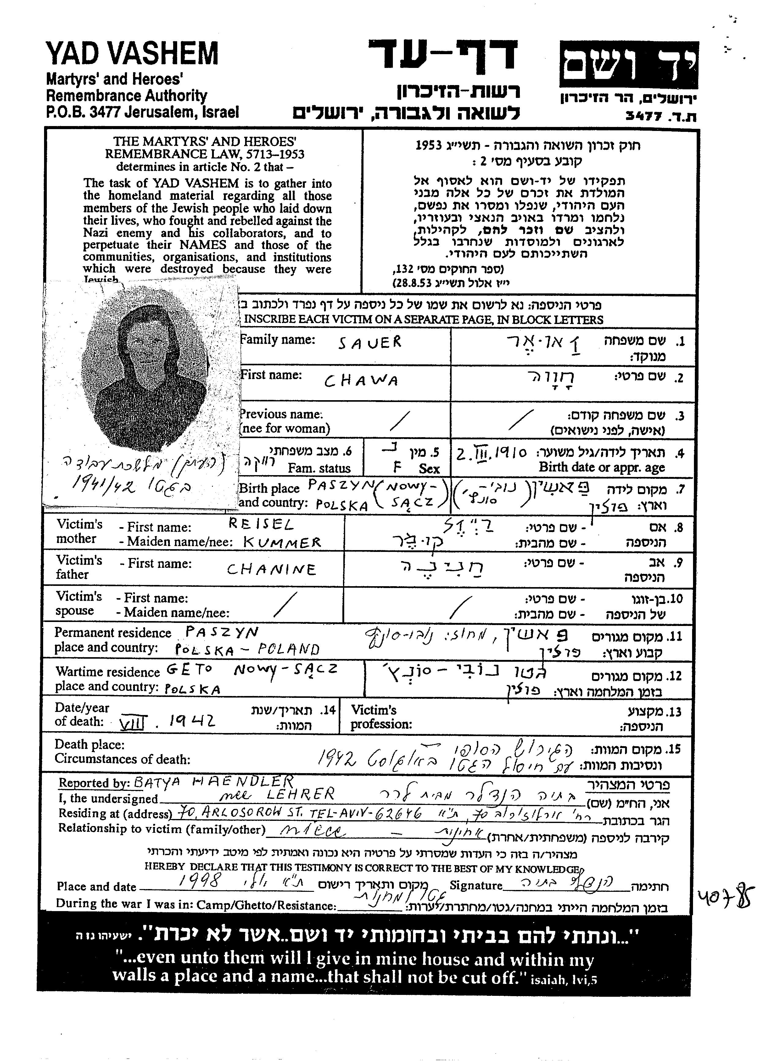 Chawa Sauer wurde im Jahr 1910 in Paszyn, Polen geboren. Vor dem Zweiten Weltkrieg lebte sie in Paszyn, Polen.