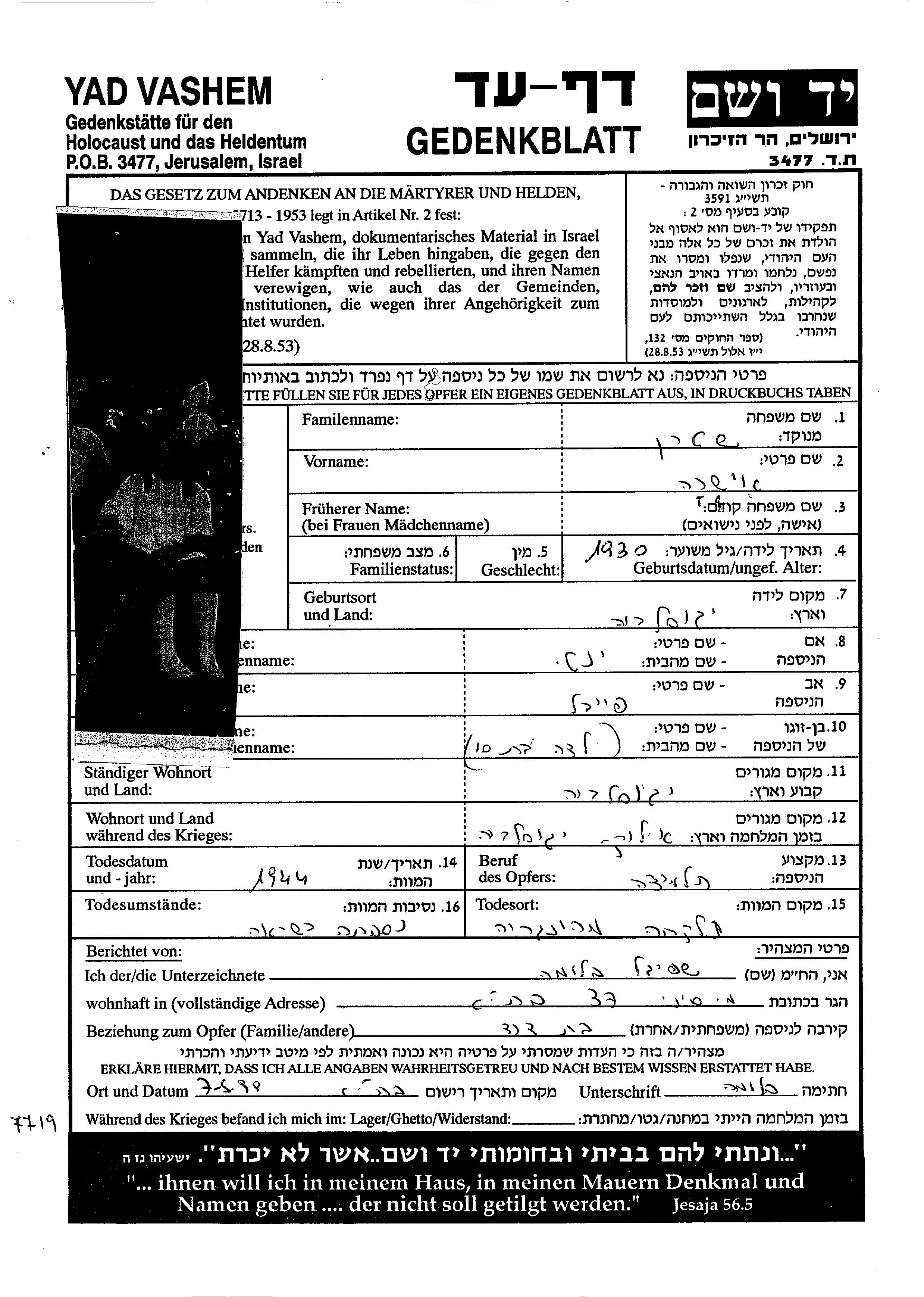 Suche nach einem Todesjahr im Zeitraum der Holocaust: 1933 bis 1945. Bitte wählen Sie 'Exakt' im Auswahlmenü, um nur nach einem einzelnen Jahr zu suchen, alternativ können Sie die flexibleren Optionen '+/- 2 Jahre' oder '+/- 5 Jahre' wählen.