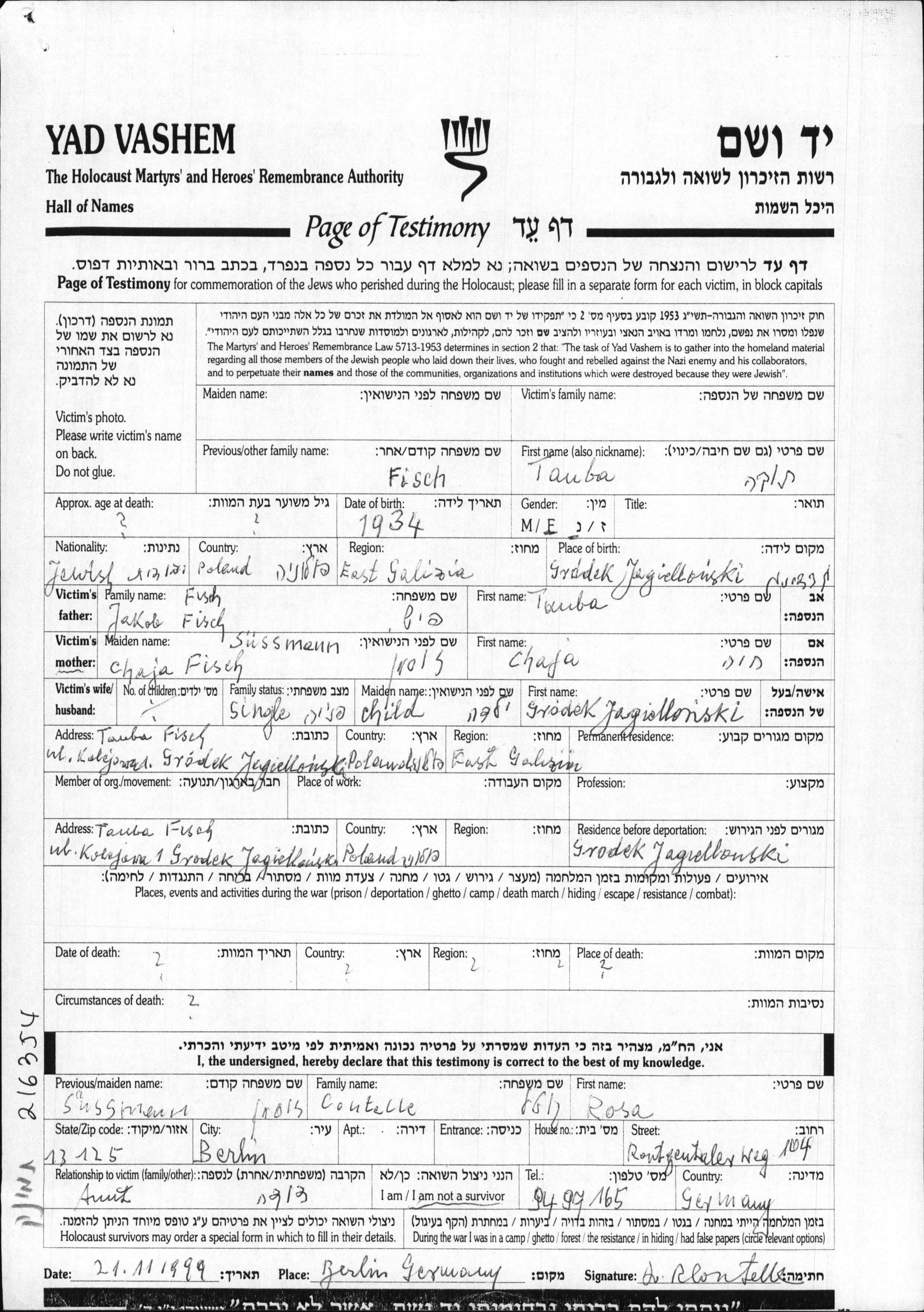Fisch | Tauba | 1934 | Grodek Jagiellonski, Polen | Gedenkblatt |