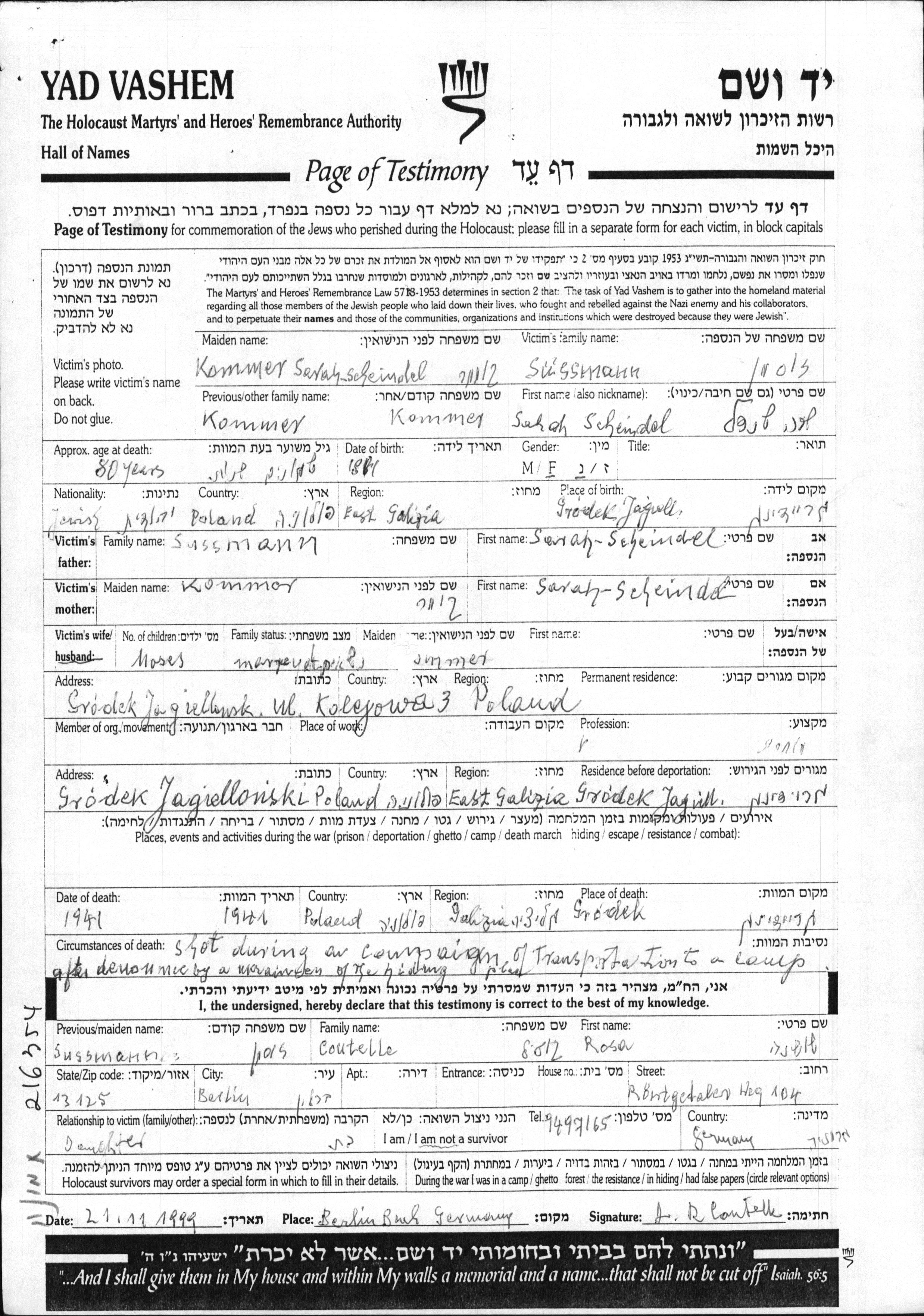 Sarah Scheindel Süssmann, geb. Kommer wurde im Jahr 1861 in Grodek Jagiellonski, Polen geboren. Vor dem Zweiten Weltkrieg lebte sie in Grodek Jagiellonski, Polen.