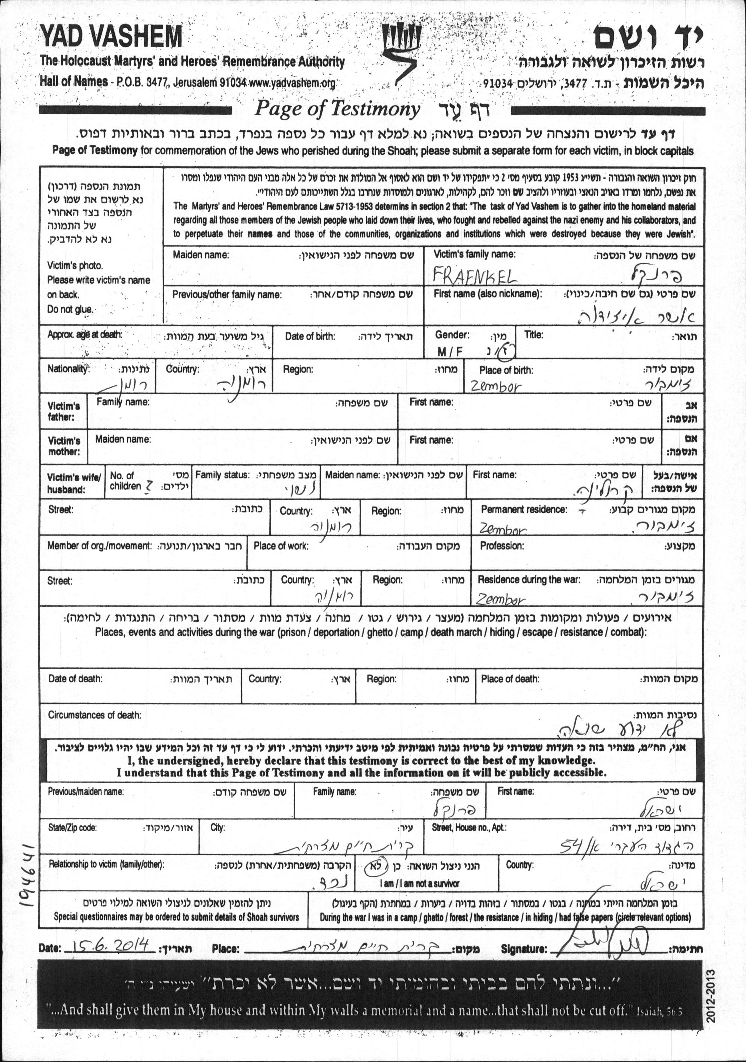 Asher Izidor Fränkel wurde in Zimboru, Rumänien geboren. Vor dem Zweiten Weltkrieg lebte er in Zimboru, Rumänien.
