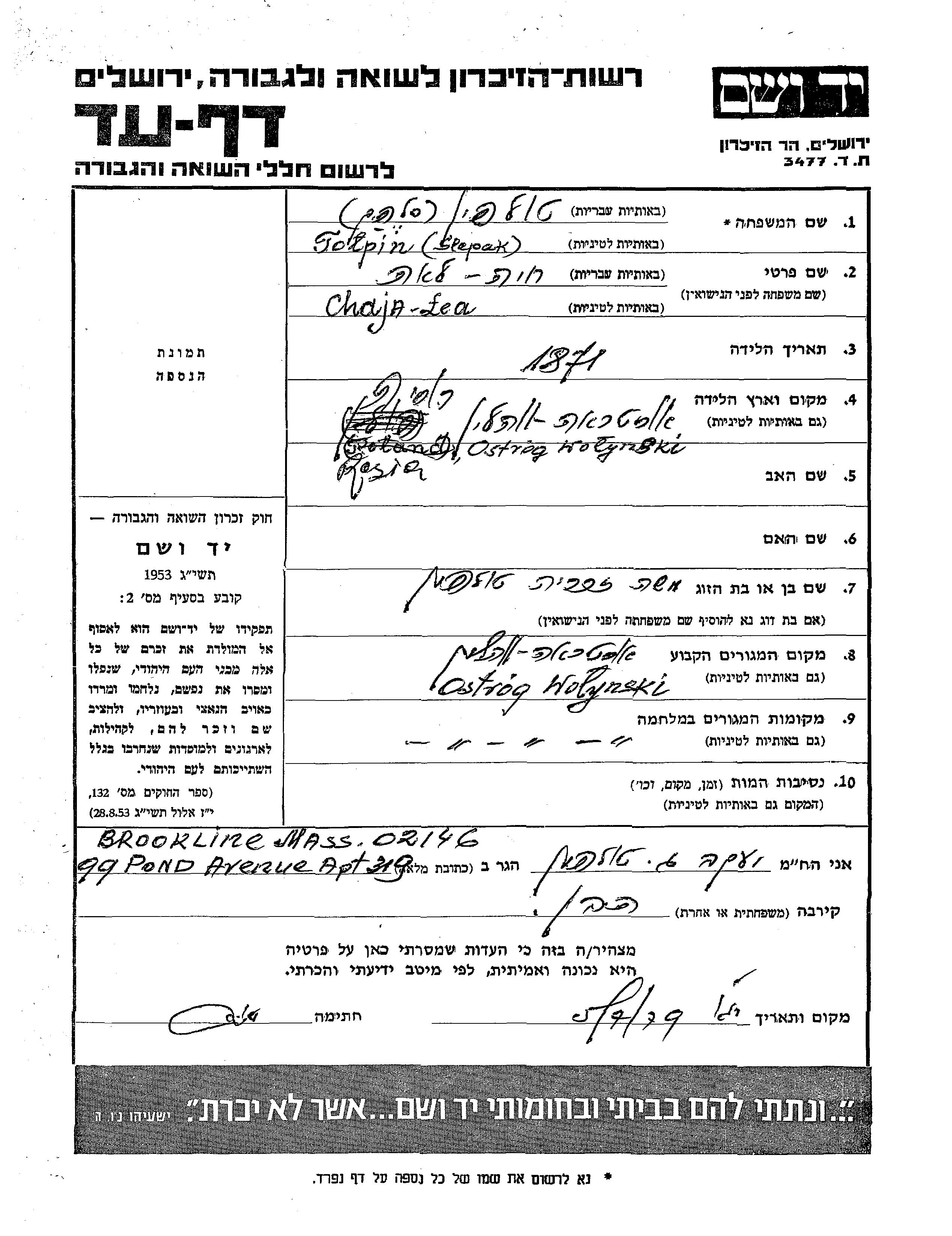 Chaja Lea Tolpin, geb. Slepak wurde im Jahr 1871 in Ostrog, Polen geboren. Vor dem Zweiten Weltkrieg lebte sie in Ostrog, Polen.