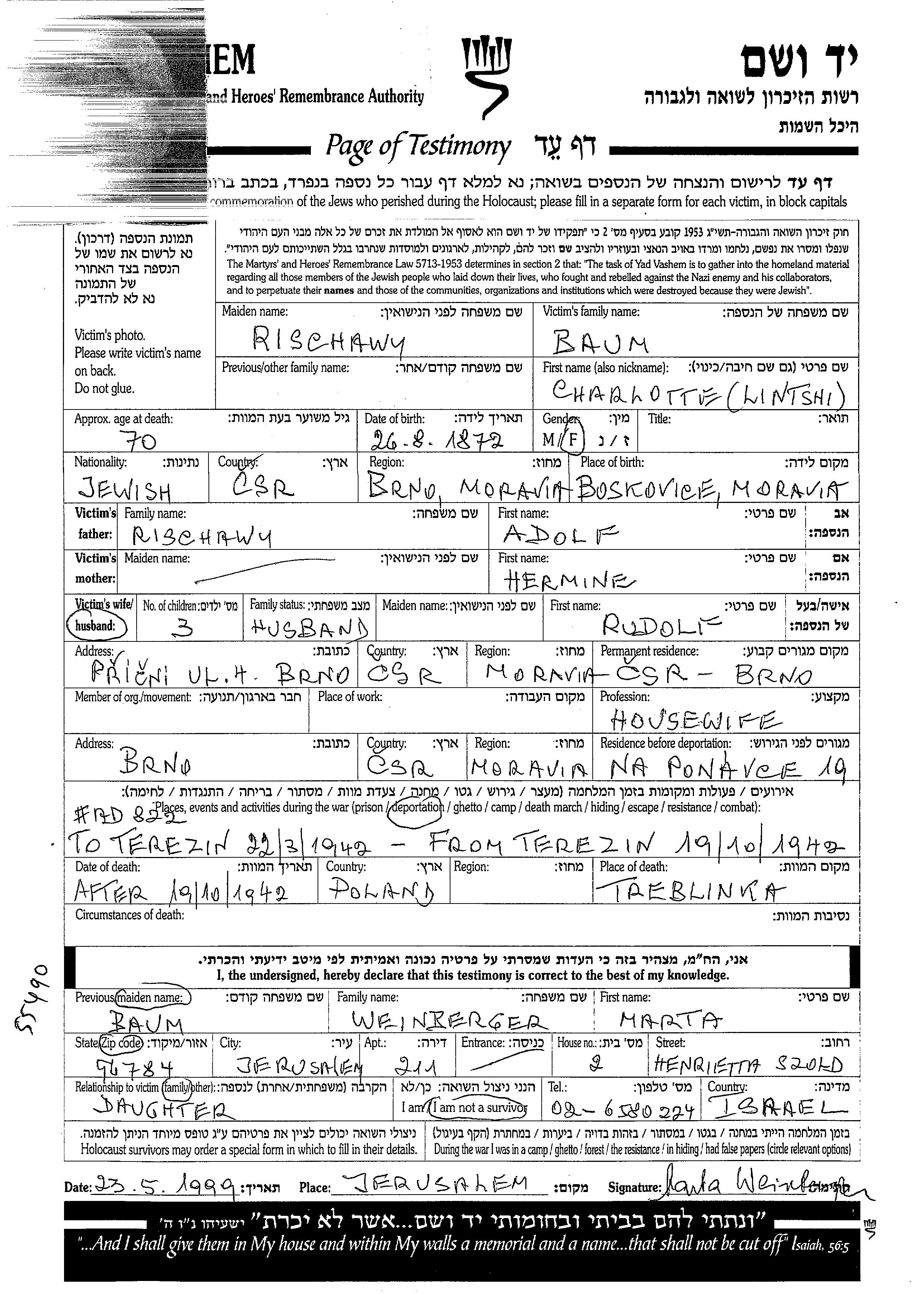 Charlotte Lintshi Baum, geb. Rischawy wurde im Jahr 1872 in Boskovice, Tschechoslowakei geboren. Sie war Hausfrau. Vor dem Zweiten Weltkrieg lebte sie in Brno, Tschechoslowakei.