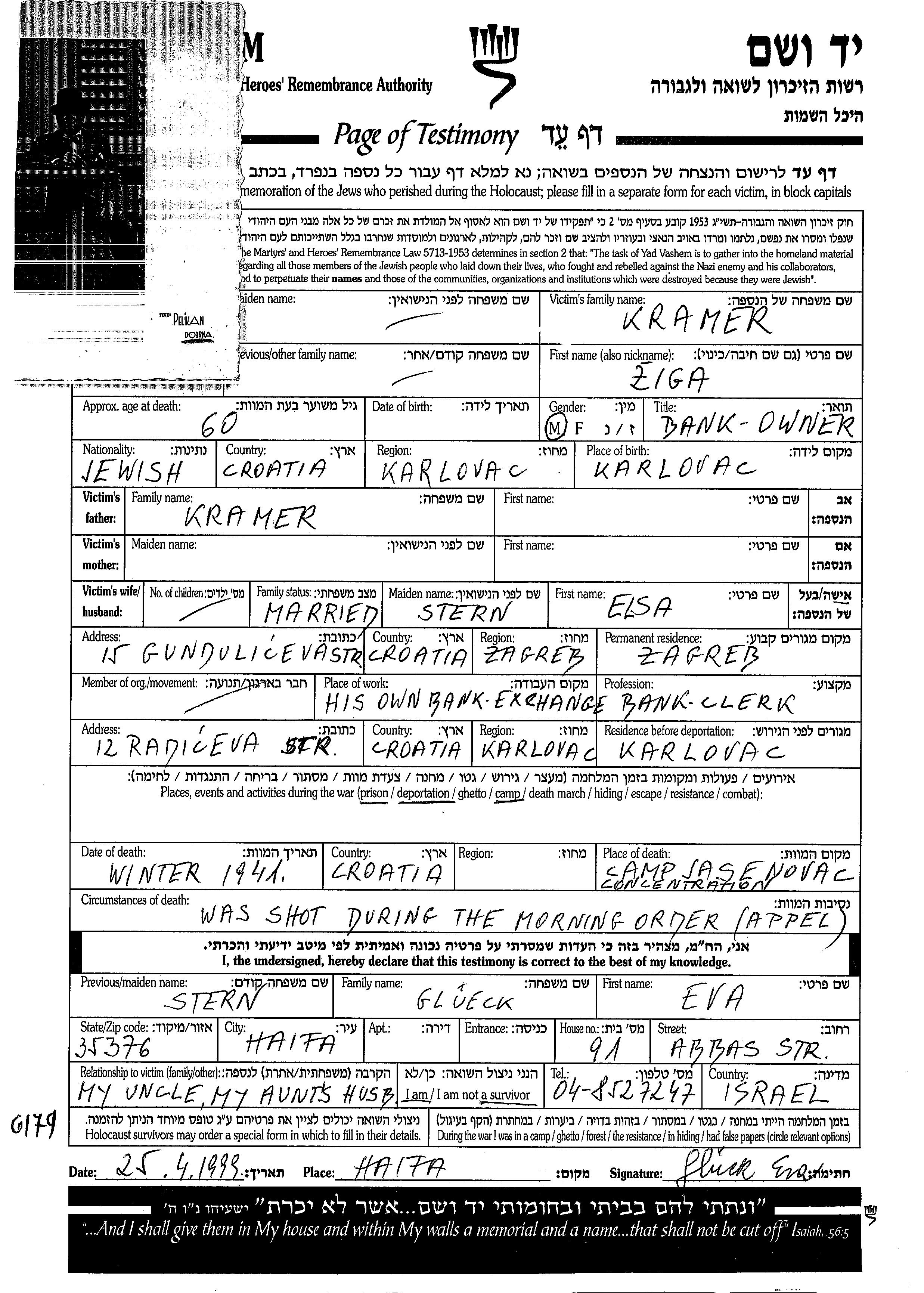Ziga wurde in der Schoah ermordet. Todesort: Jasenovac, Jugoslawien im Jahr 01/1941.