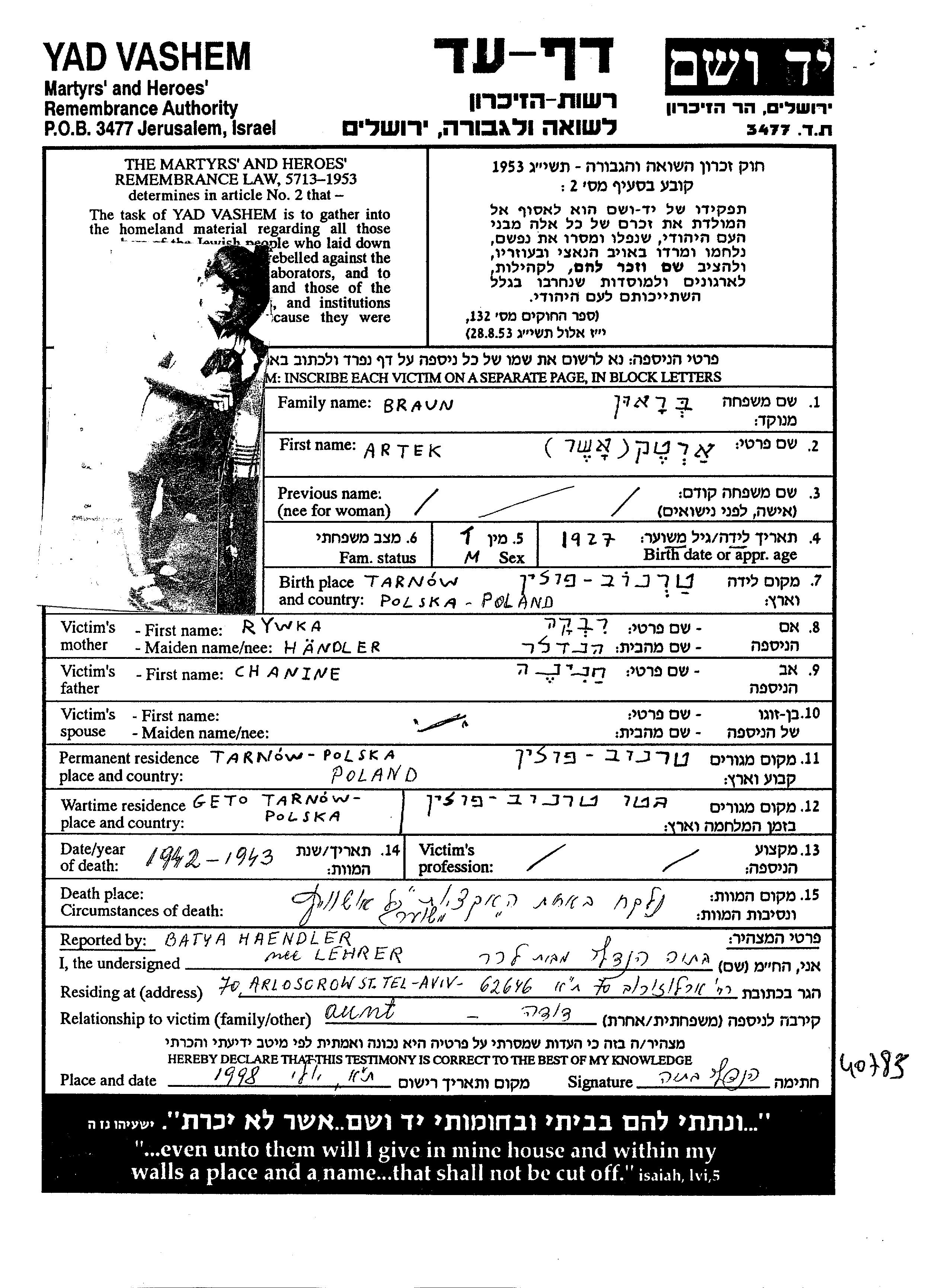 Artek Asher Braun wurde im Jahr 1927 in Tarnow, Polen geboren. Vor dem Zweiten Weltkrieg lebte er in Tarnow, Polen.