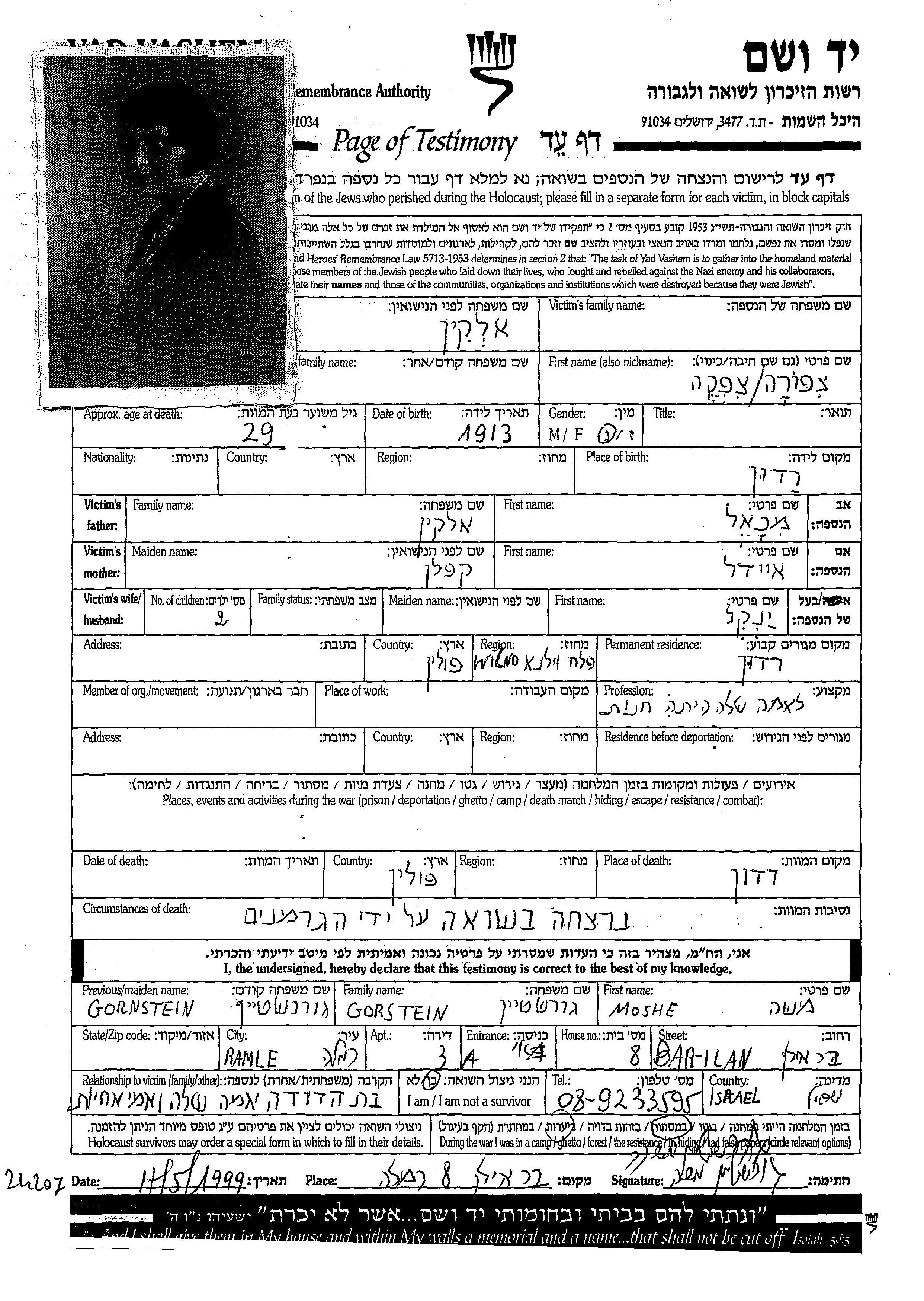 Tzipora Elkin wurde im Jahr 1913 in Radun, Polen geboren. Sie war Ladengehilfin. Vor dem Zweiten Weltkrieg lebte sie in Radun, Polen.