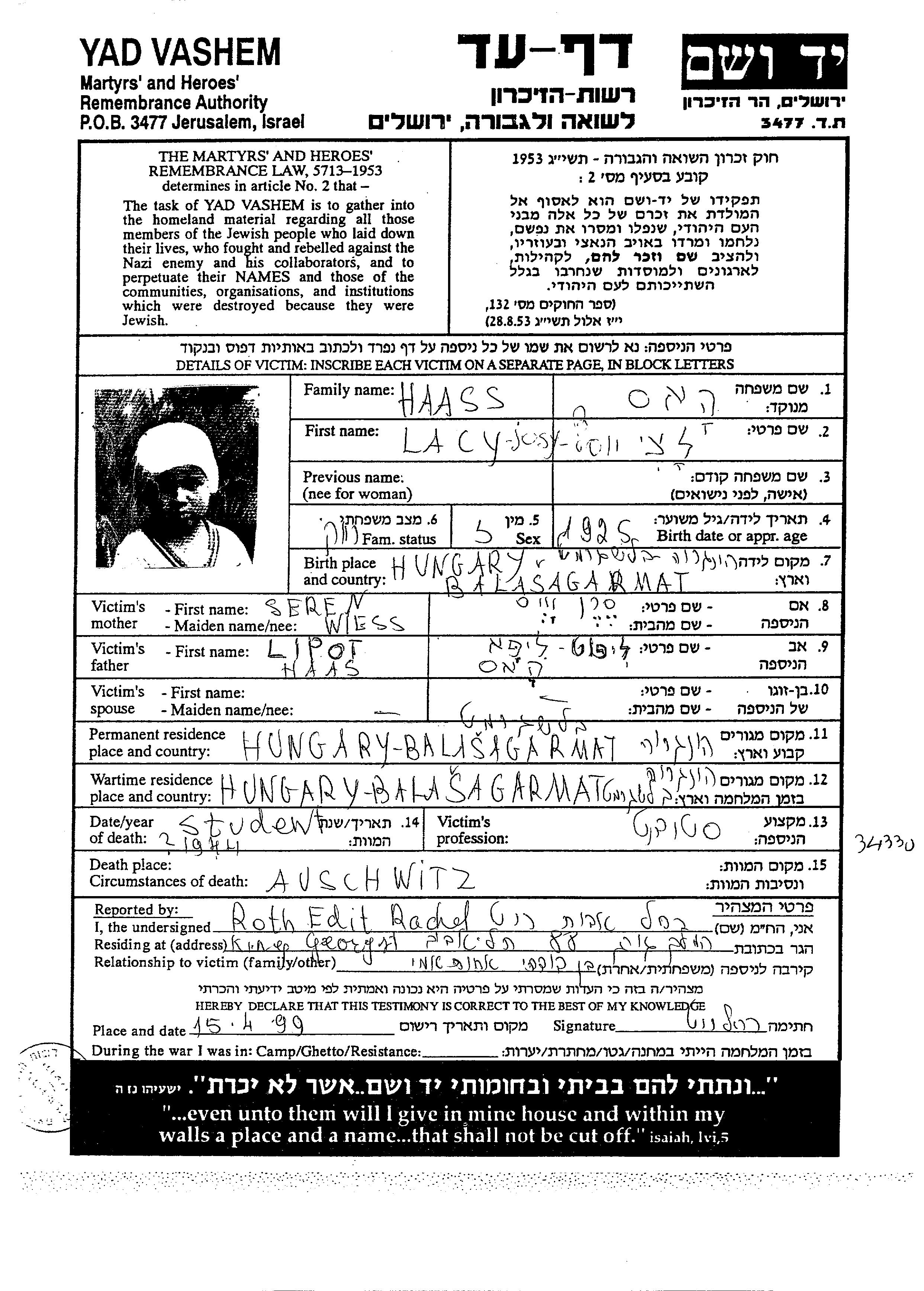 Lacy Josy Haass wurde im Jahr 1925 in Balassagyarmat, Ungarn geboren. Er war Student. Vor dem Zweiten Weltkrieg lebte er in Balassagyarmat, Ungarn.