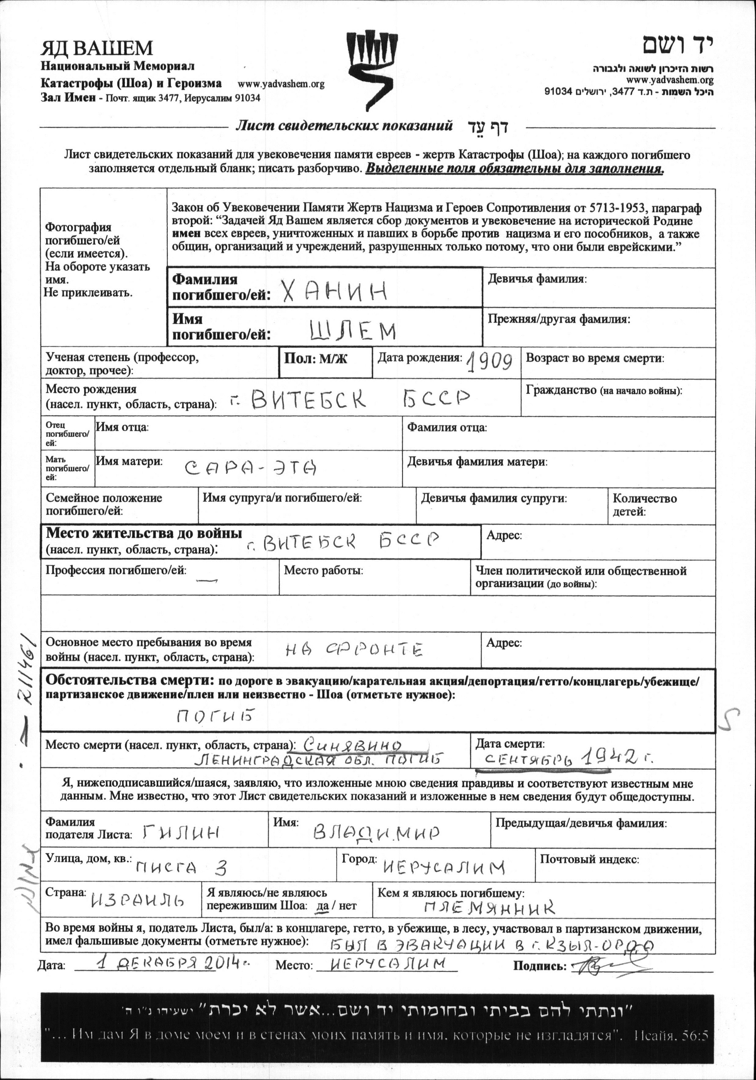 Shlem im Militärdienst umgekommen. Todesort: Sinyavino, Russland (UdSSR) im Jahr 09/1942.