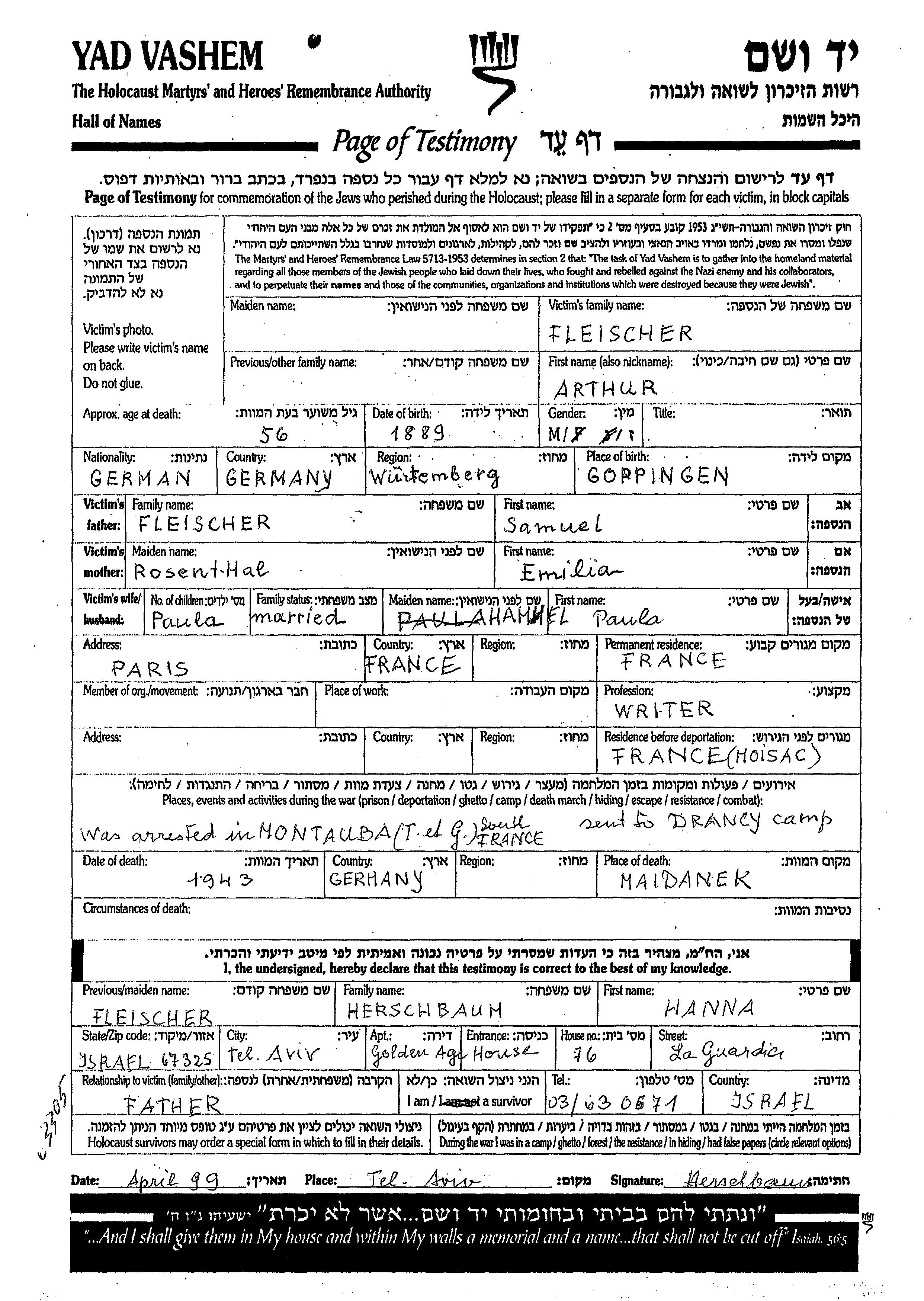 Arthur Fleischer wurde im Jahr 1889 in Goeppingen, Deutsches Reich geboren. Er war Schriftsteller. Vor dem Zweiten Weltkrieg lebte er in Paris, Frankreich.