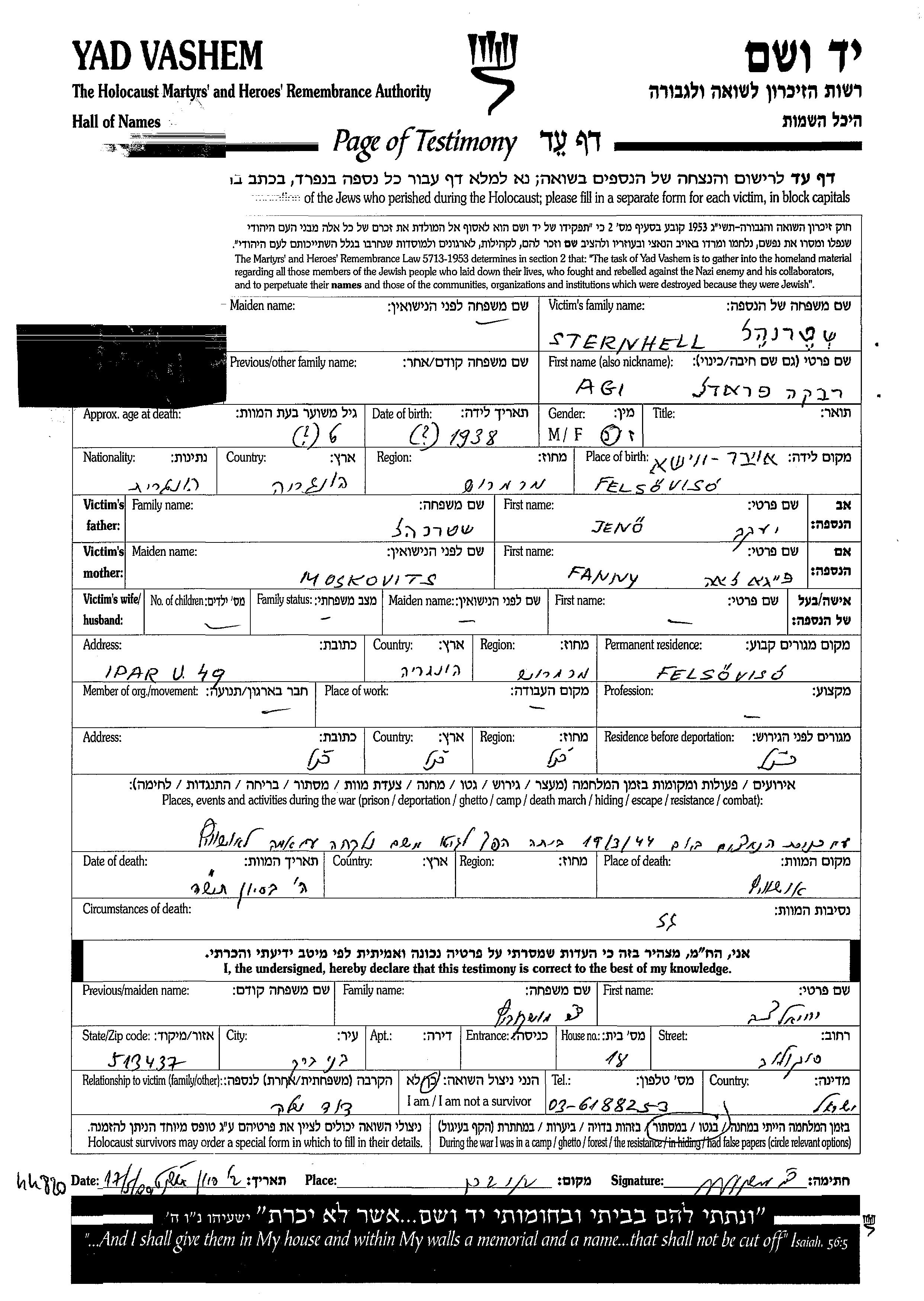 Agi Rivka Sternhell wurde im Jahr 1938 in Viseul de Sus, Rumänien geboren. Vor dem Zweiten Weltkrieg lebte sie in Viseul de Sus, Rumänien.