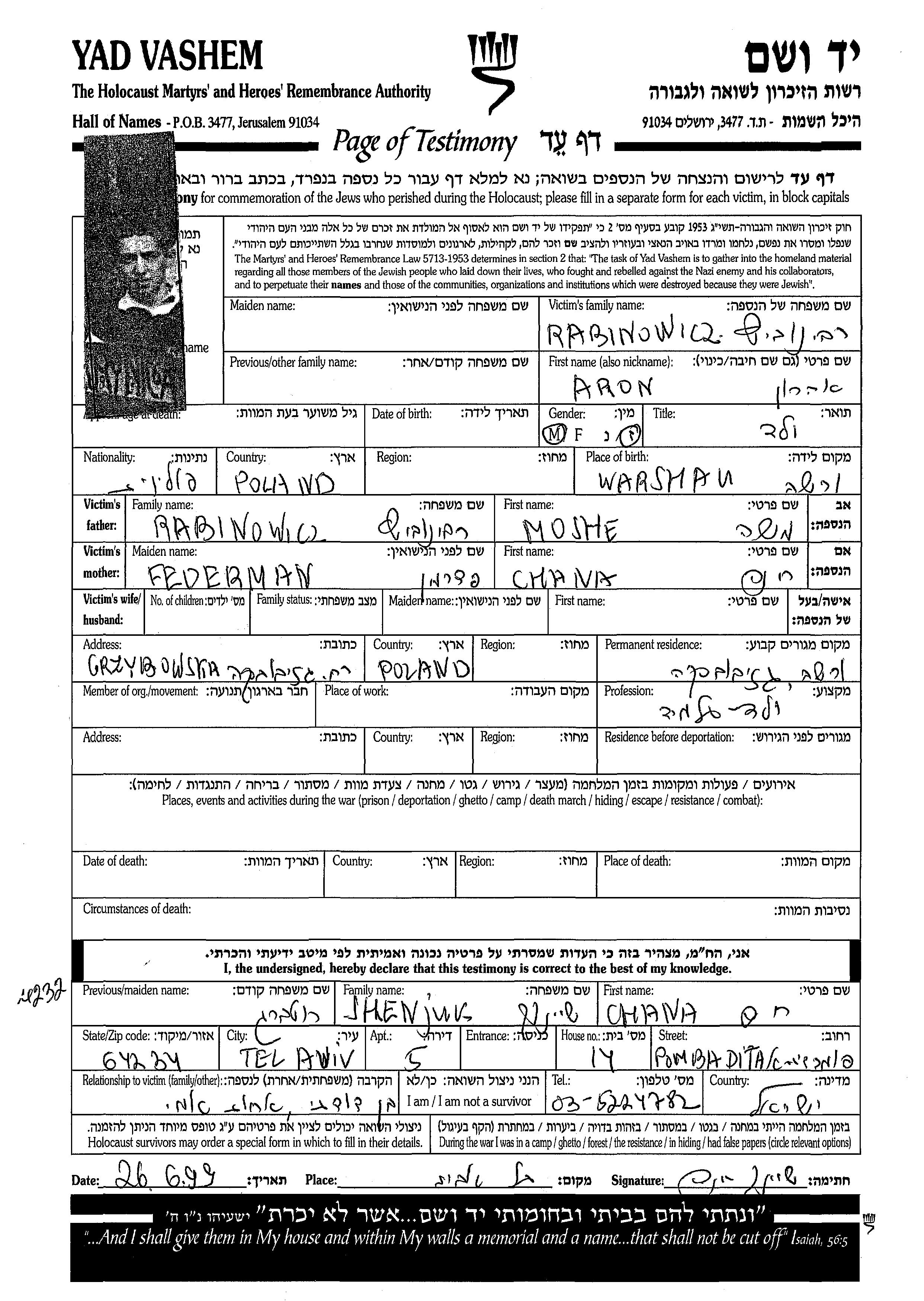 Aron Rabinowicz wurde in Warszawa, Polen geboren. Er war Schüler/-in. Vor dem Zweiten Weltkrieg lebte er in Warszawa, Polen.