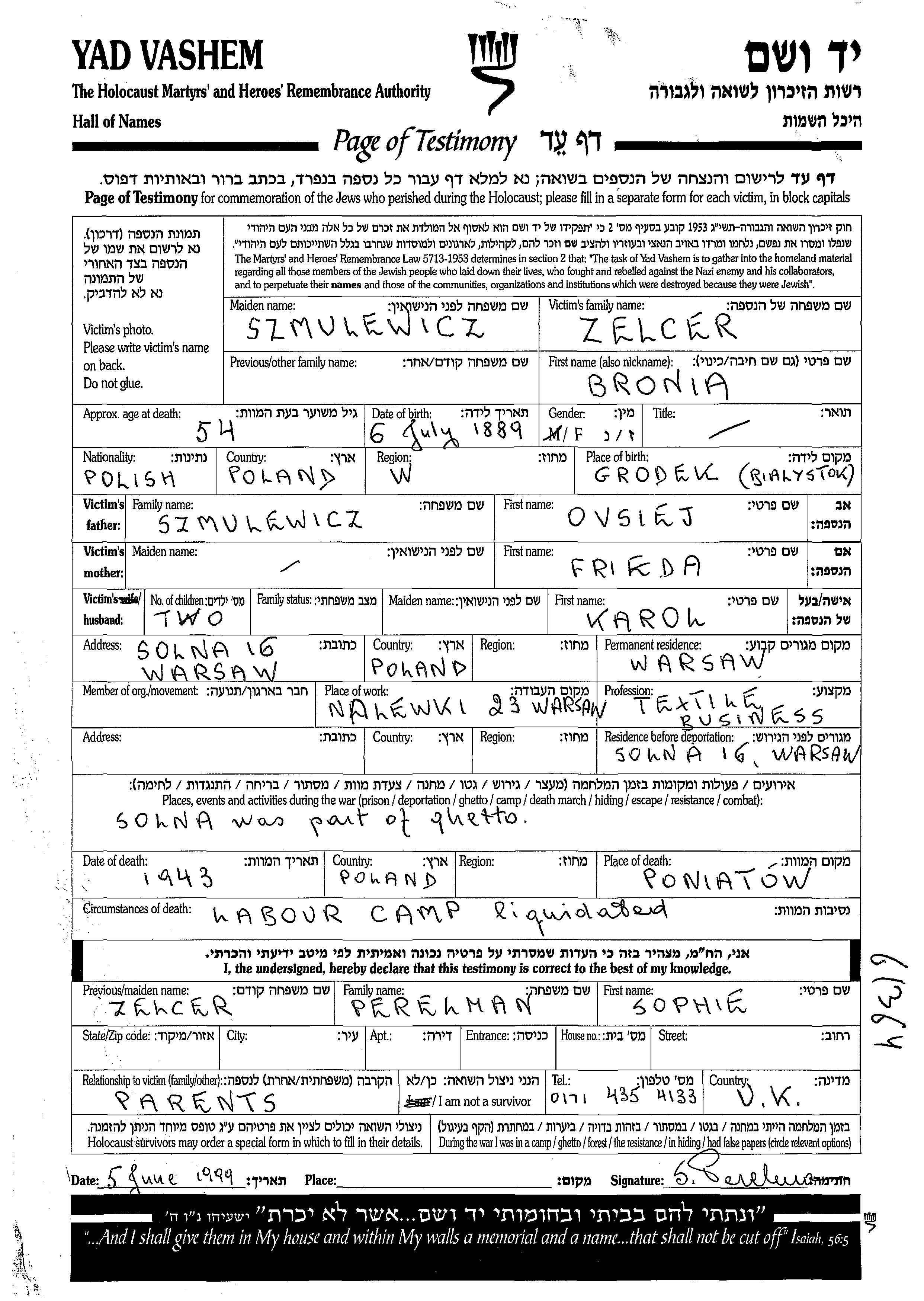 Bronia Zelcer, geb. Szmulewicz wurde im Jahr 1889 in Gródek, Polen geboren. Vor dem Zweiten Weltkrieg lebte sie in Warszawa, Polen.