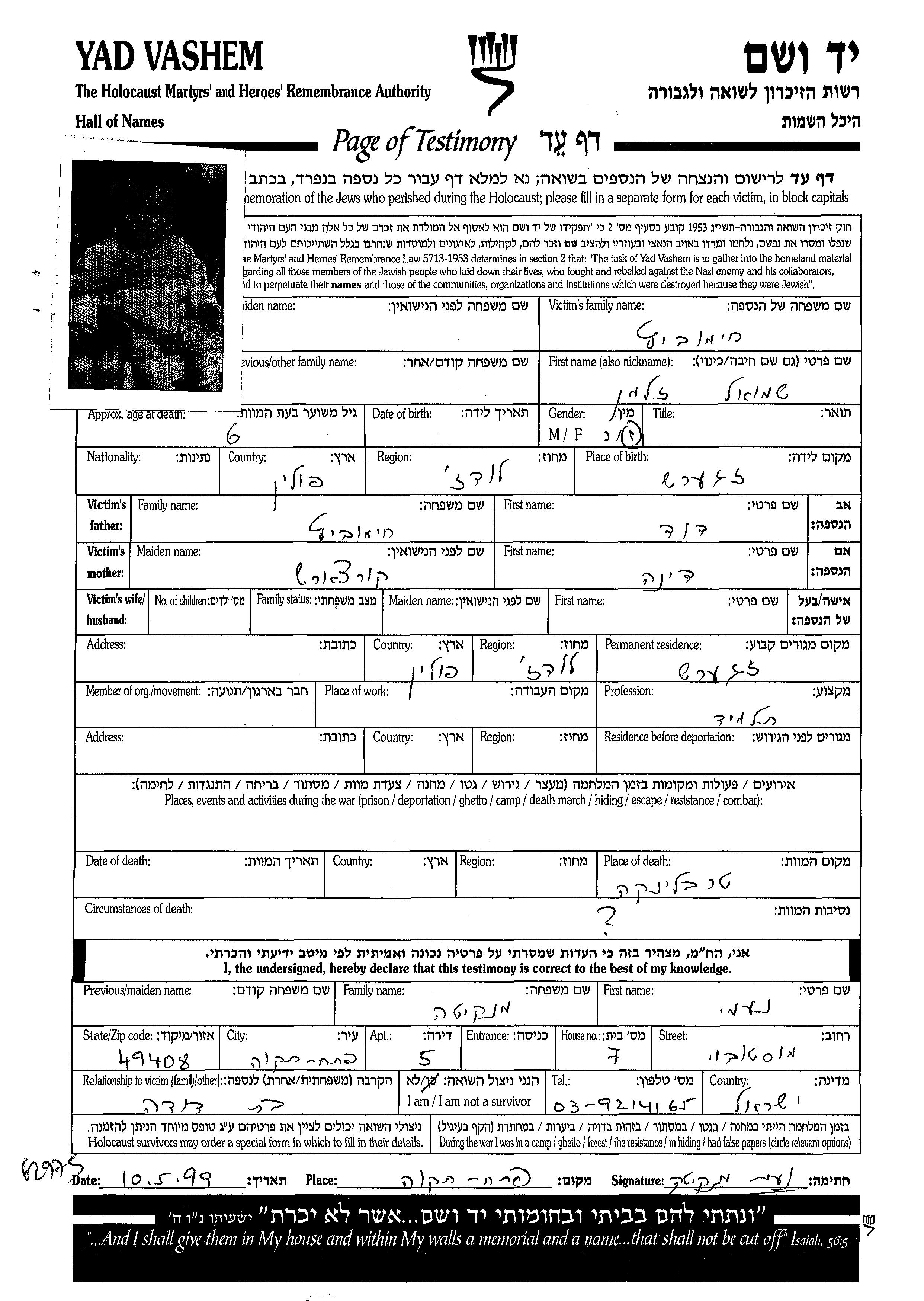 Shmuel Zalman wurde in der Schoah ermordet. Todesort: Treblinka, Polen.