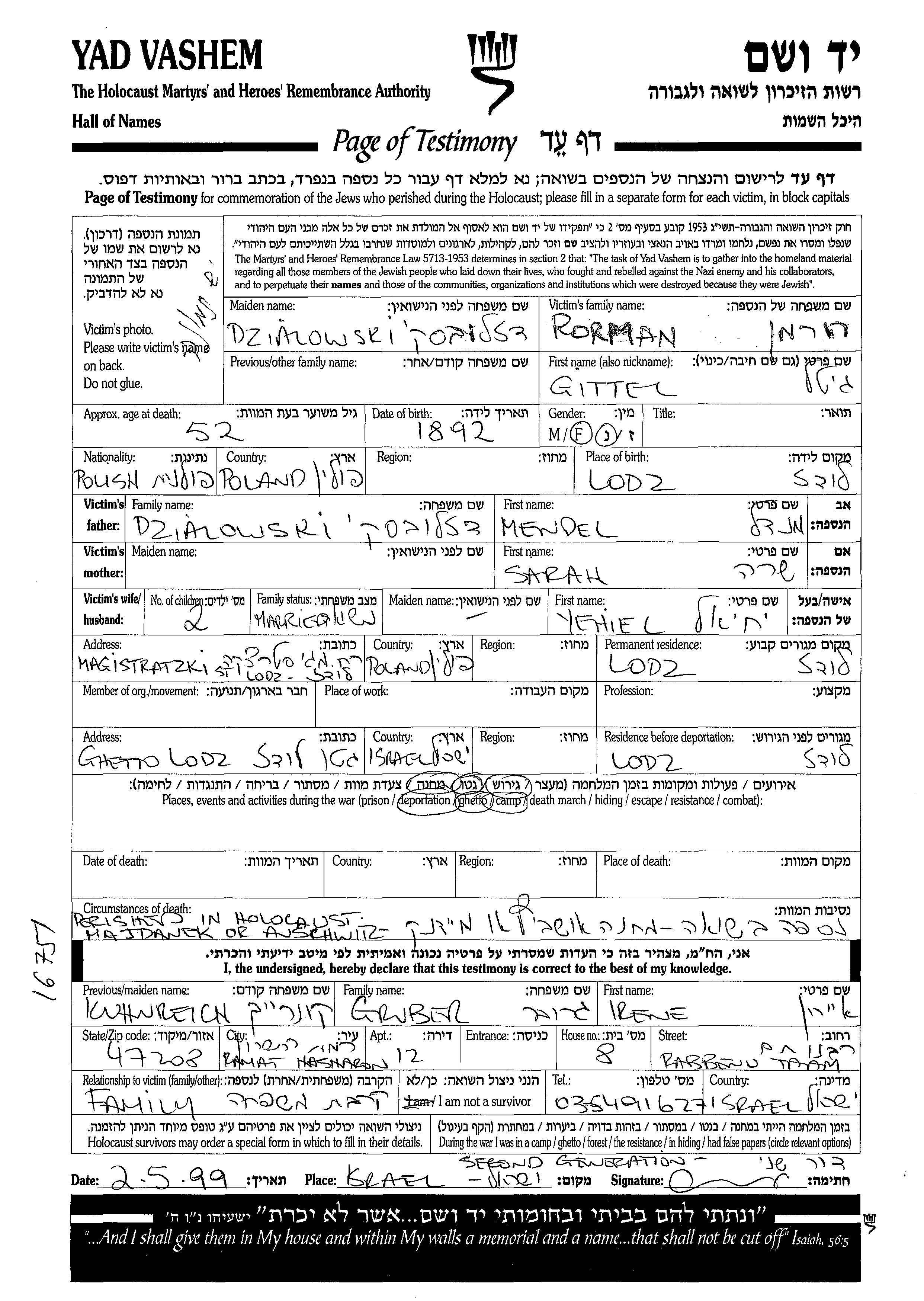 Gittel Rorman, geb. Dzialowski wurde im Jahr 1892 in Łódź, Polen geboren. Vor dem Zweiten Weltkrieg lebte sie in Łódź, Polen.