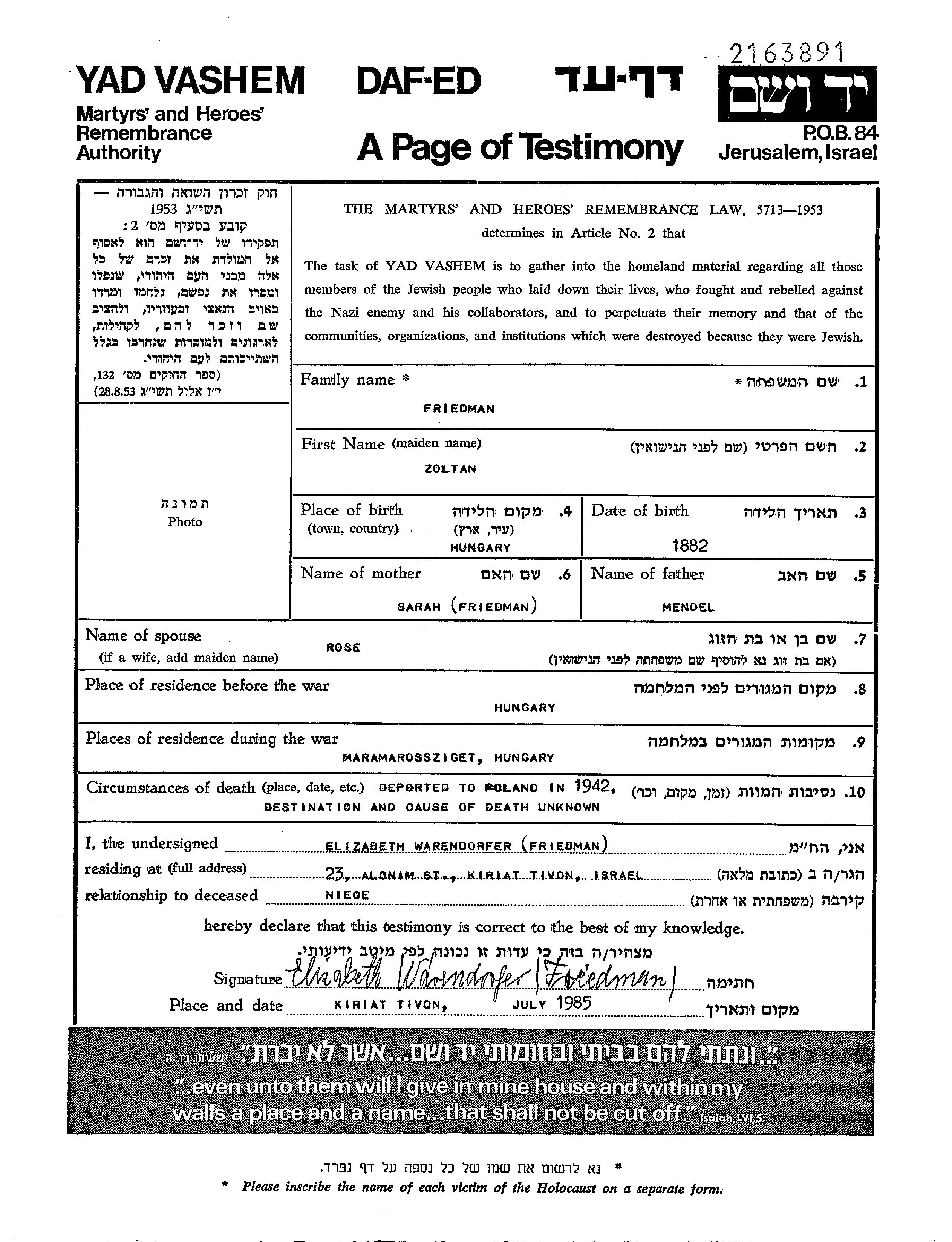 Zoltan Friedman wurde im Jahr 1882 in Ungarn geboren. Er war der Sohn von Mendel und Sarah. Er war mit Roza Verheiratet. Vor dem Zweiten Weltkrieg lebte er in Ungarn. Während des Krieges war er in Maramarossziget, Rumänien.