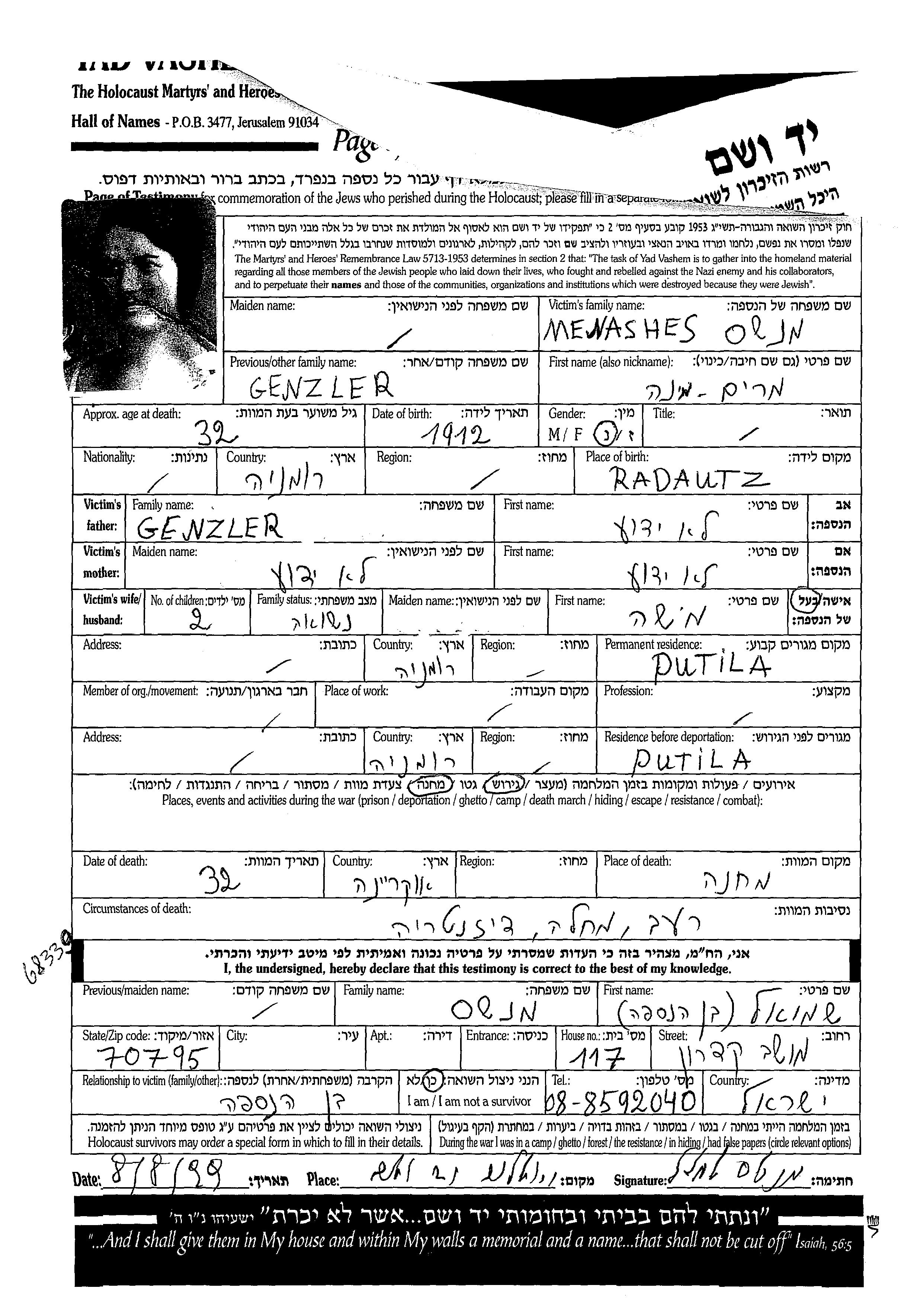 Miriam Menashes wurde im Jahr 1912 in Radauti, Rumänien geboren. Vor dem Zweiten Weltkrieg lebte sie in Putila, Rumänien.