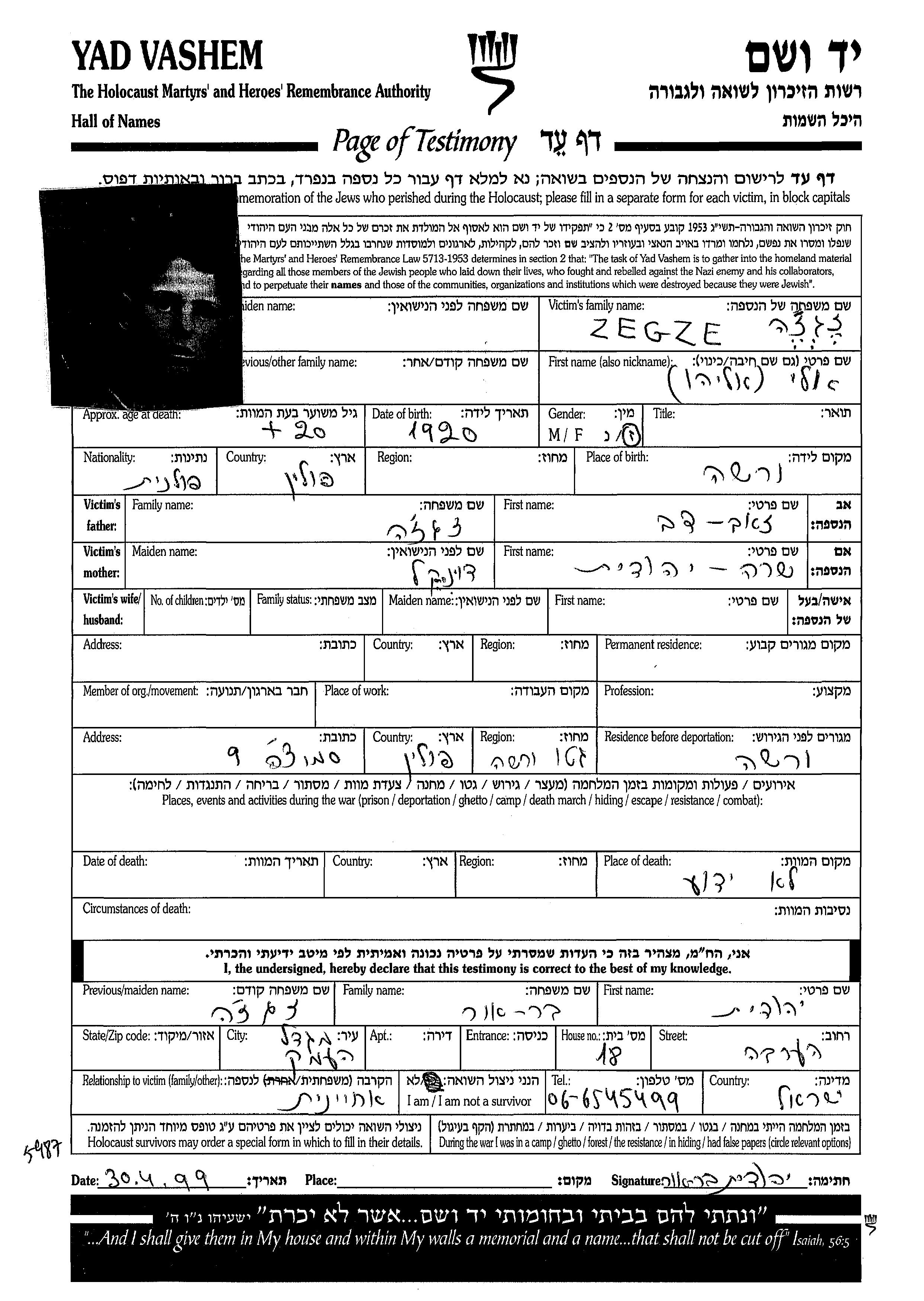 Eli Zegze wurde im Jahr 1920 in Warszawa, Polen geboren.