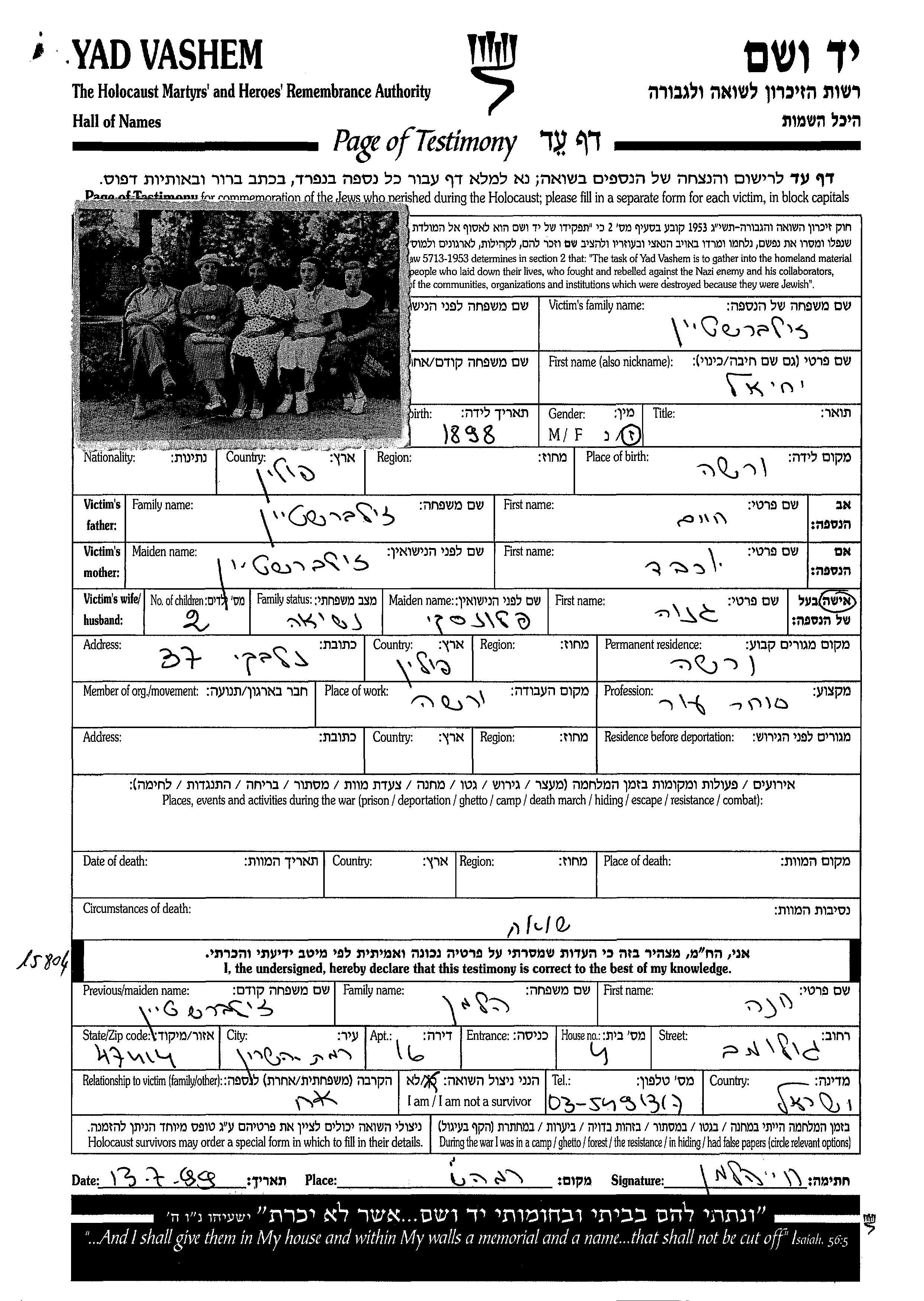 Zilbershtein | Yekhiel | 1898 | Warszawa, Polen | Gedenkblatt |