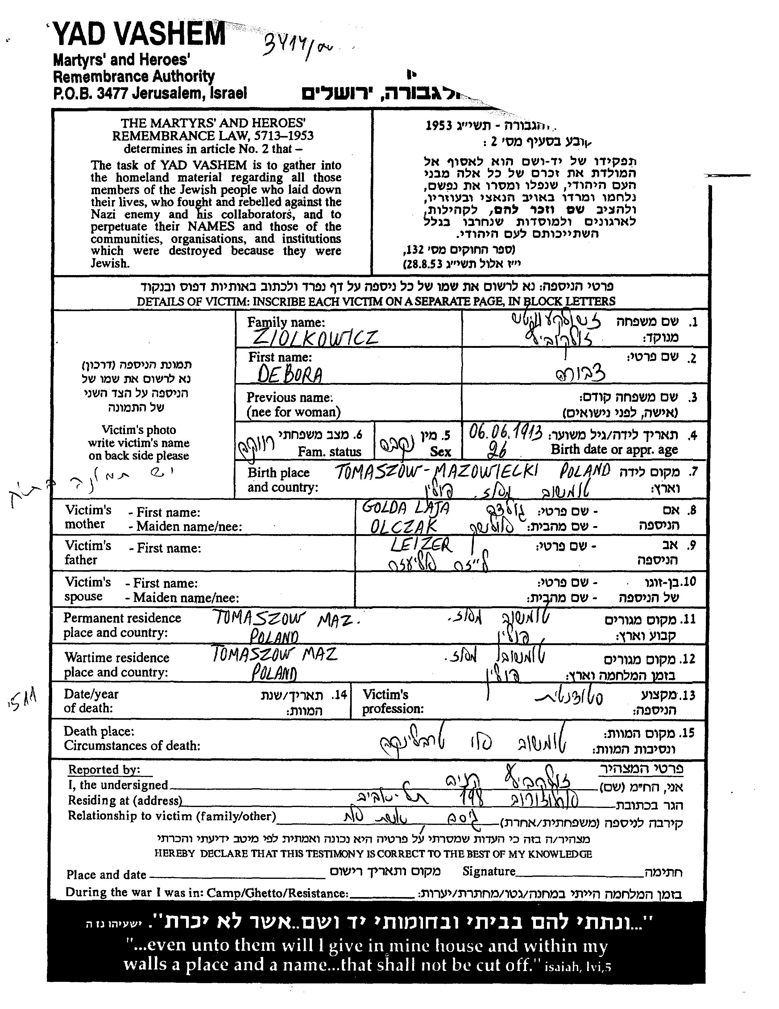 Ziolkowicz | Debora | 1913 | Tomaszow Mazowieckie, Polen | Gedenkblatt |