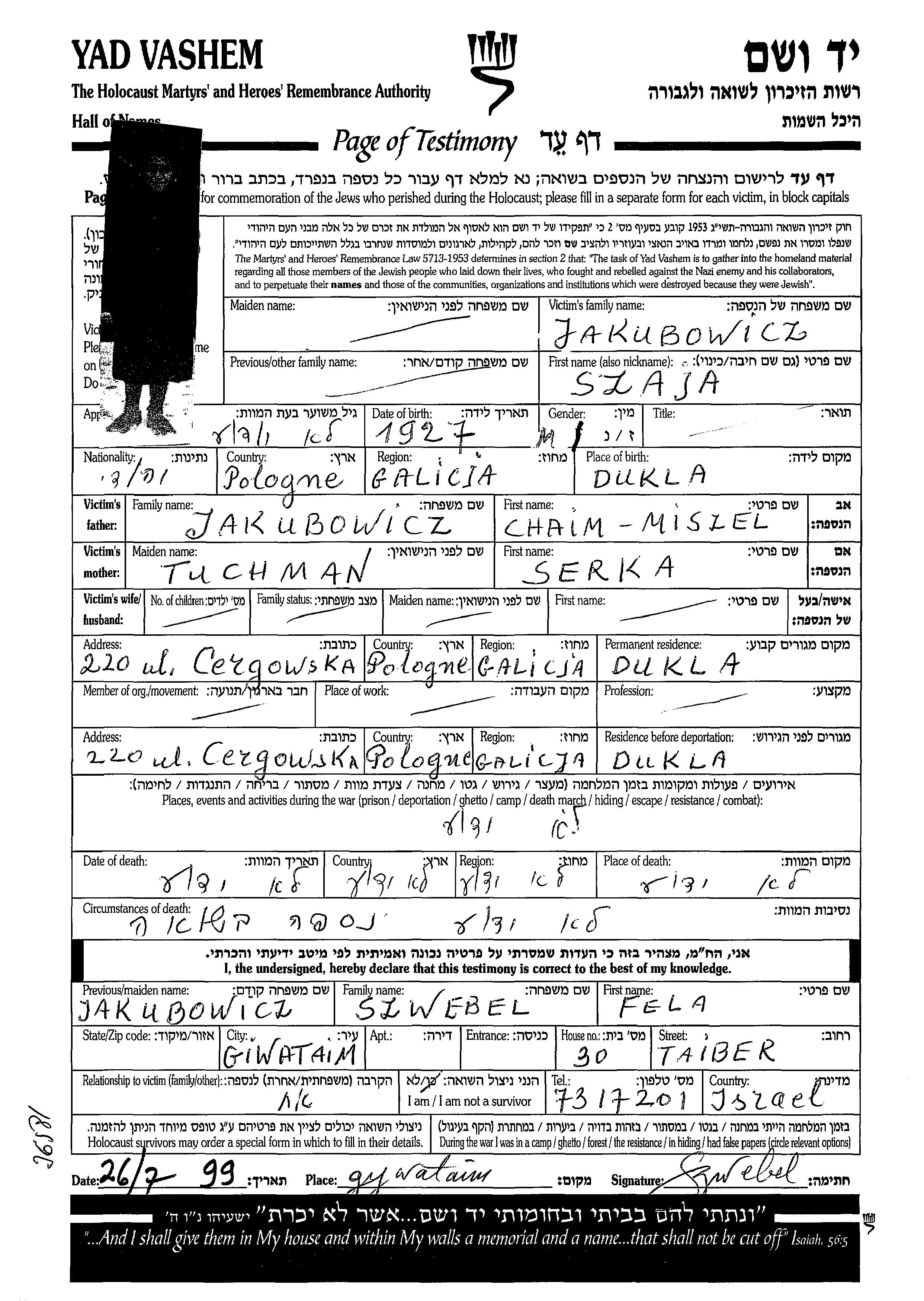 Jakubowicz Szaja 1927 Dukla, Polen Gedenkblatt