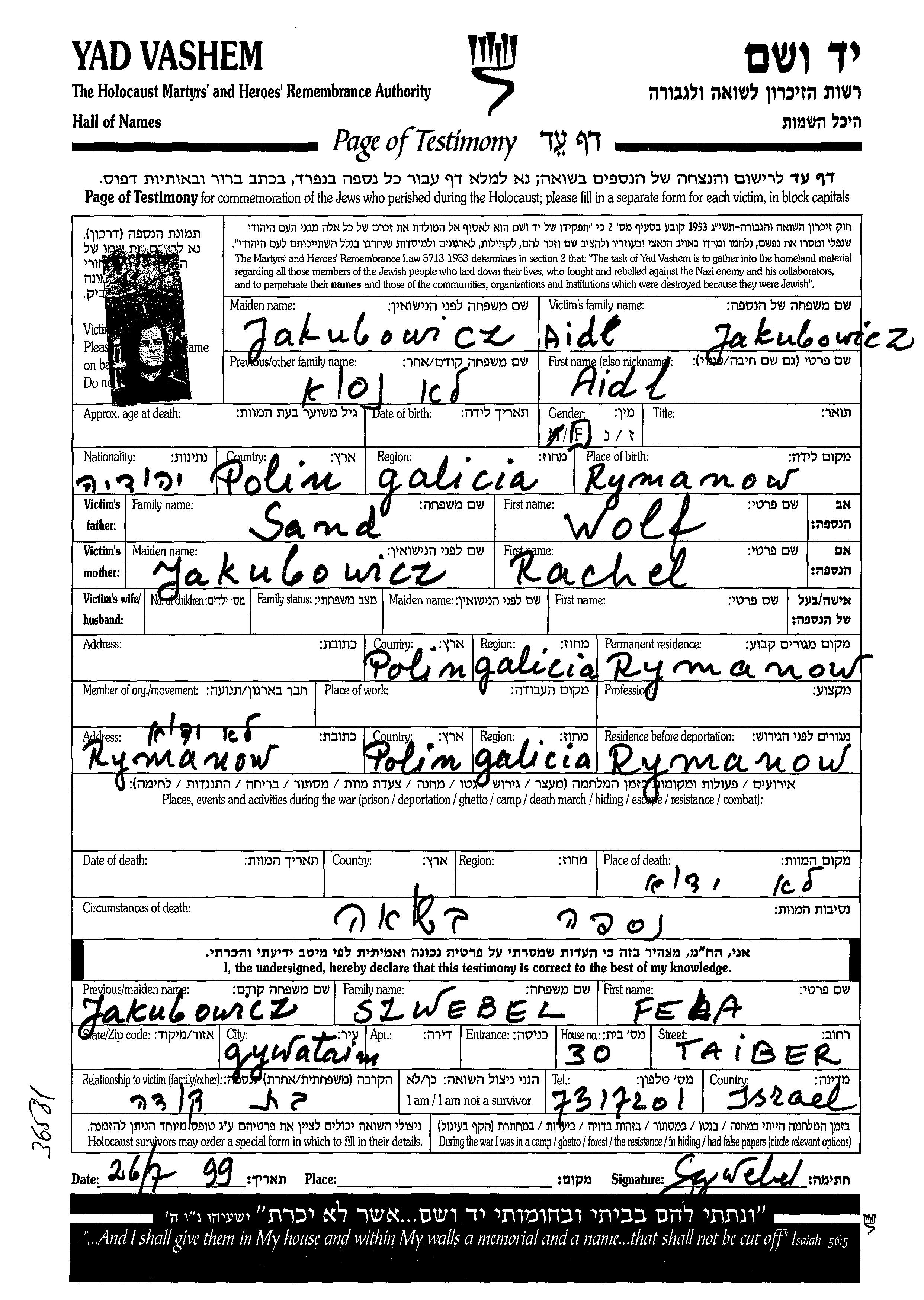 Aidl Jakubowicz wurde in Rymanow, Polen geboren. Vor dem Zweiten Weltkrieg lebte sie in Rymanow, Polen.
