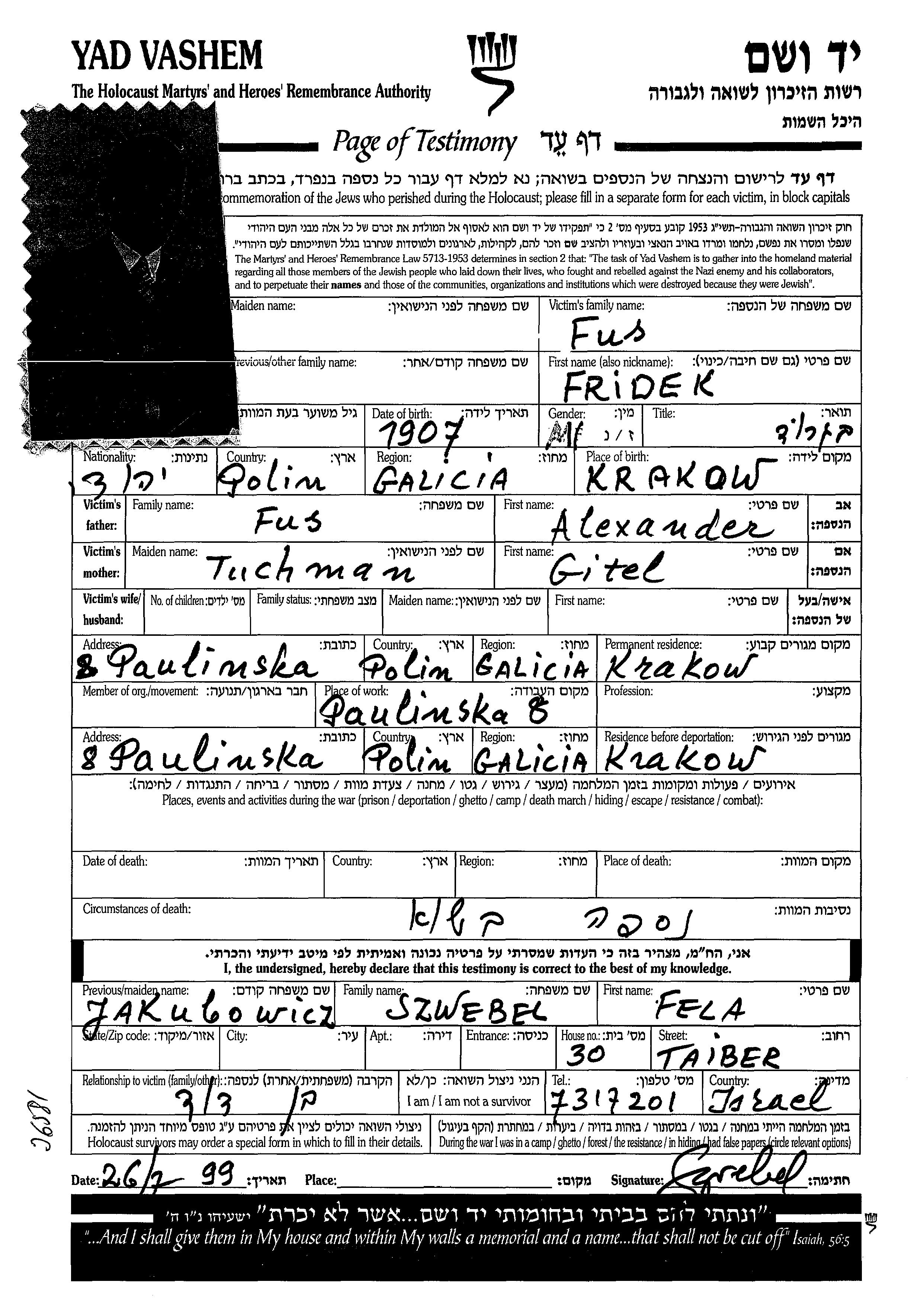 Fridek Fus wurde im Jahr 1907 in Krakow, Polen geboren. Vor dem Zweiten Weltkrieg lebte er in Krakow, Polen.