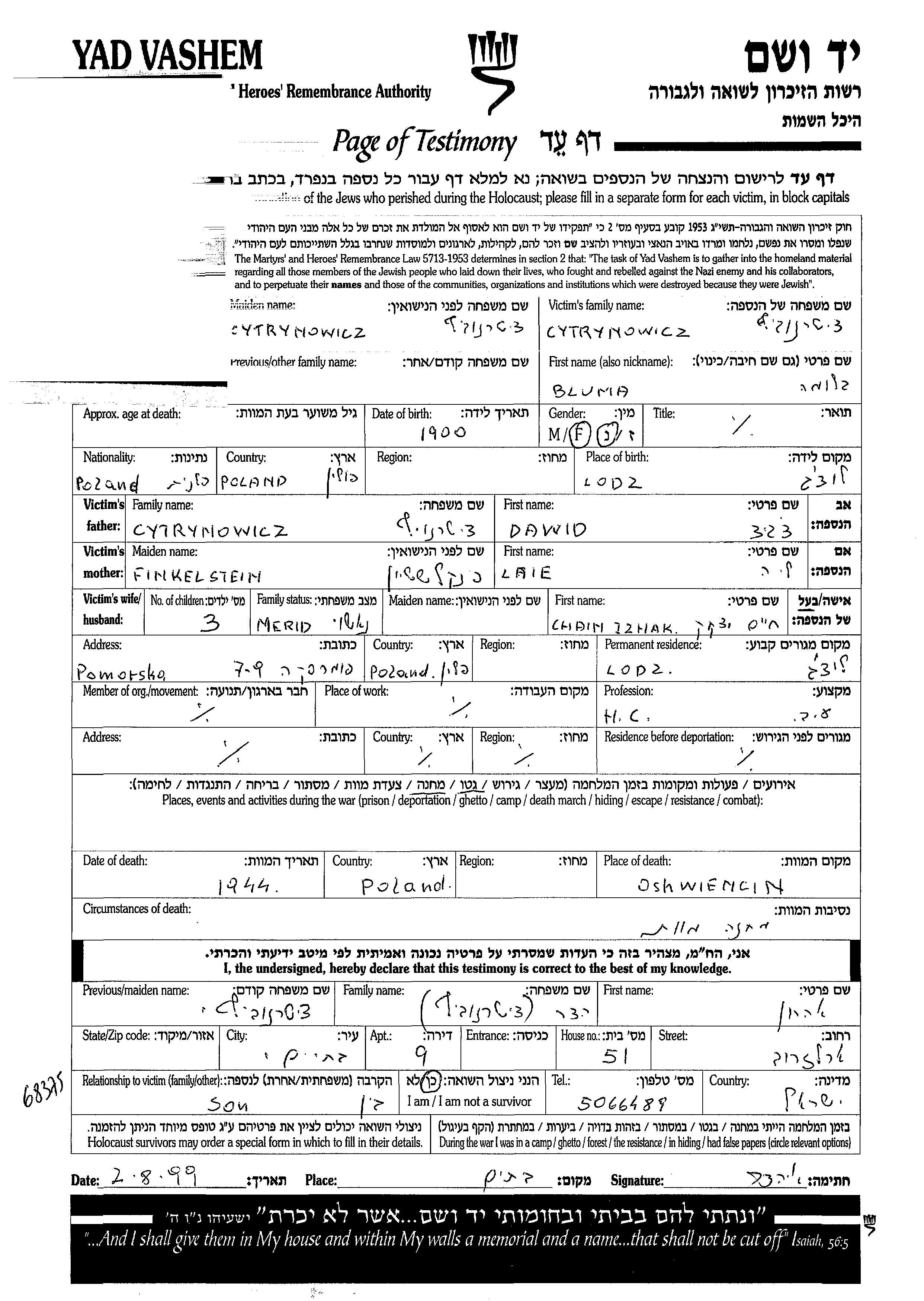 Bluma Cytrynowicz wurde im Jahr 1900 in Łódź, Polen geboren. Sie war Hausfrau. Vor dem Zweiten Weltkrieg lebte sie in Łódź, Polen.
