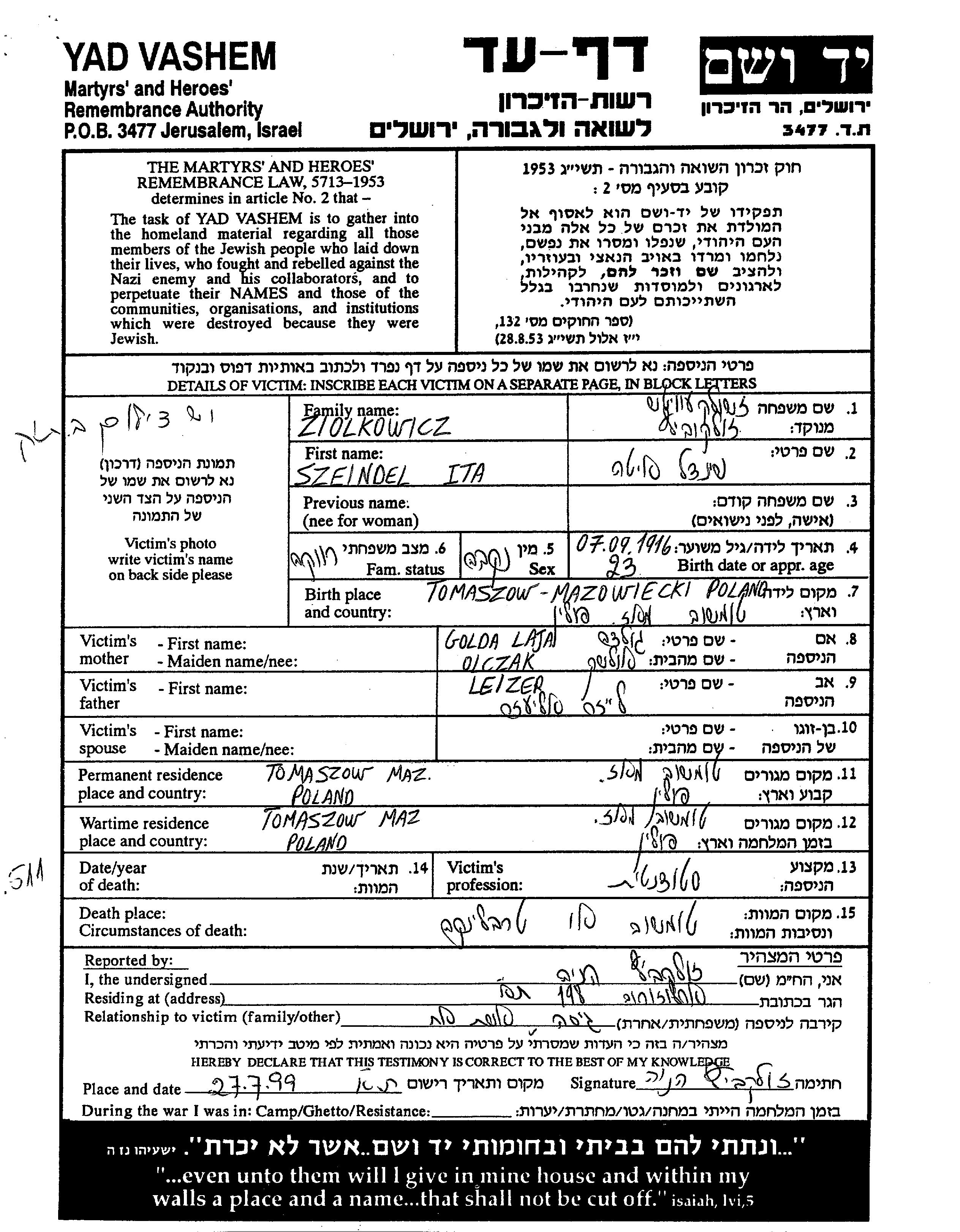 Szeindel Ita Ziolkowicz wurde im Jahr 1916 in Tomaszow Mazowiecki, Polen geboren. Sie war Student. Vor dem Zweiten Weltkrieg lebte sie in Tomaszow Mazowiecki, Polen.
