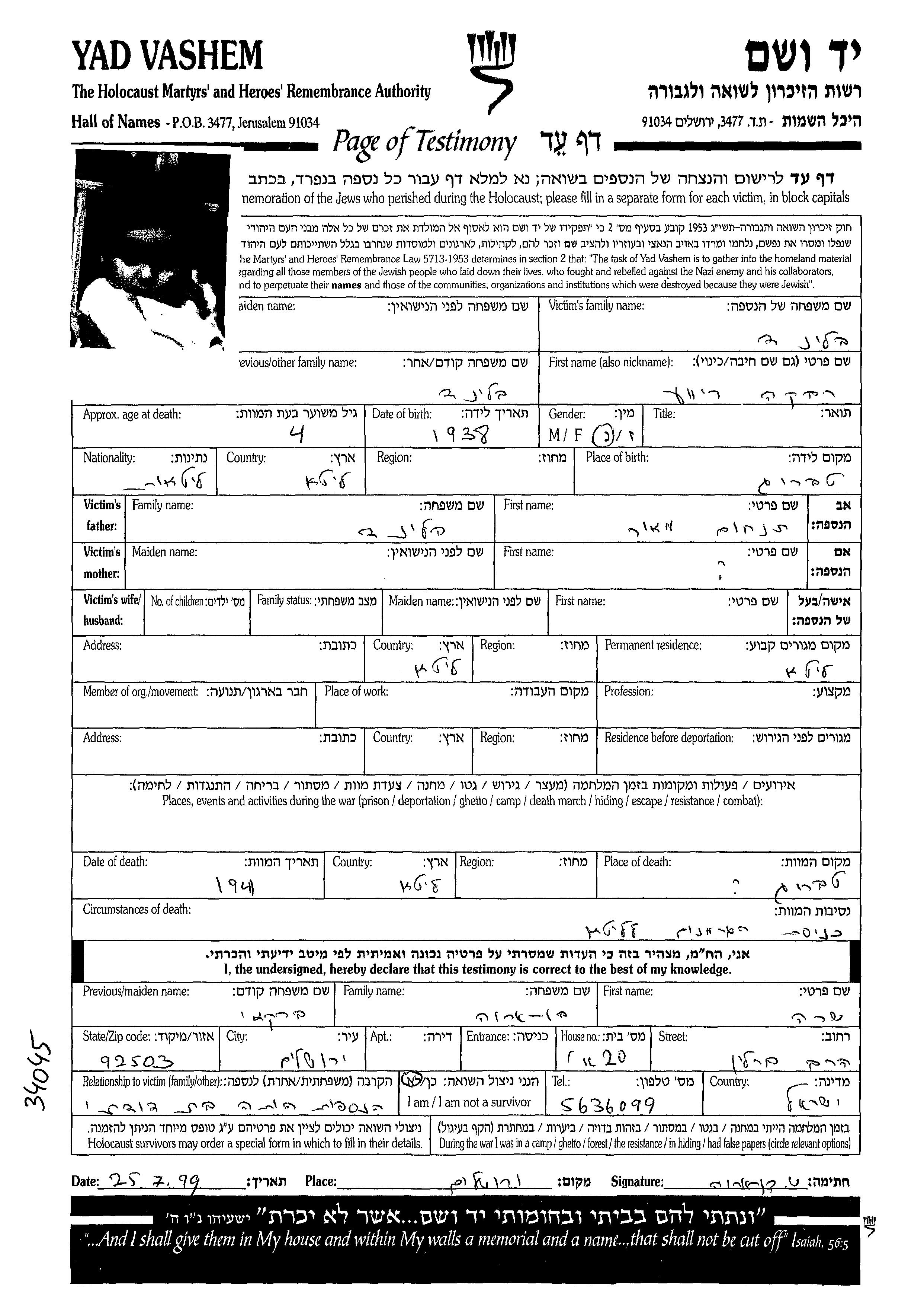 Rivka wurde in der Schoah ermordet. Todesort: Taurage, Litauen im Jahr 1941.