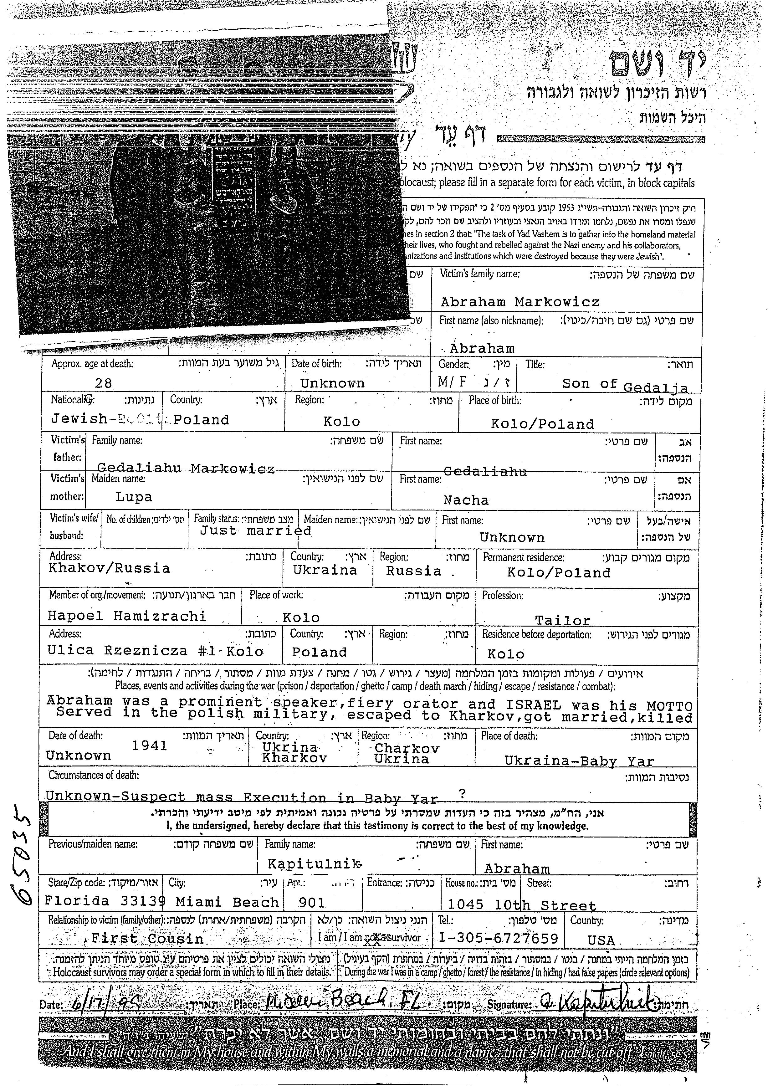 Abraham wurde in der Schoah ermordet. Todesort: Babi Yar, Ukraine (UdSSR) im Jahr 1941.